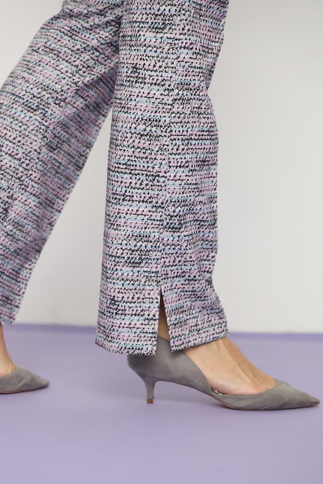 Модель имеет классический крой с зауженными к низу штанинами и небольшим разрезом по боковому шву. Высокая посадка подчеркивает талию и обеспечивает комфортную посадку. Брюки изготовлены из качественного смесового материала, состоящего из полиэстера, хлопка и эластана.