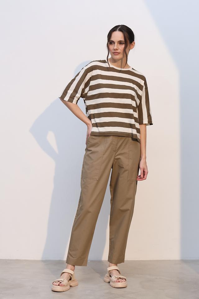 Состав ткани: 59% хлопок и 41% лиоцел. Хлопок обеспечивает мягкость и воздухопроницаемость, а лиоцел — приятные тактильные ощущения и устойчивость к сминанию. Эти брюки идеально подходят для повседневной носки и создания стильных образов.
