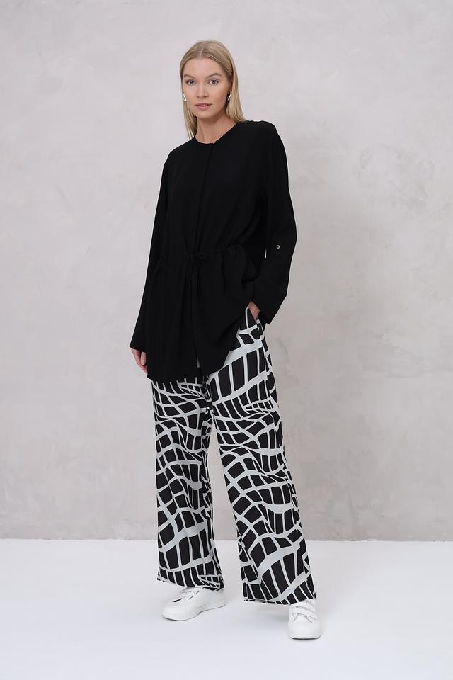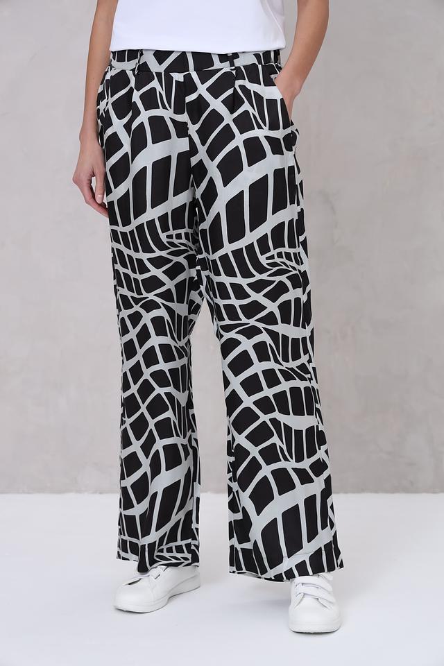Особенностью модели является яркий геометрический принт в чёрно-белой гамме, который придаёт брюкам современный и стильный вид. Прямой крой и эластичный пояс на талии обеспечивают удобную посадку по фигуре.