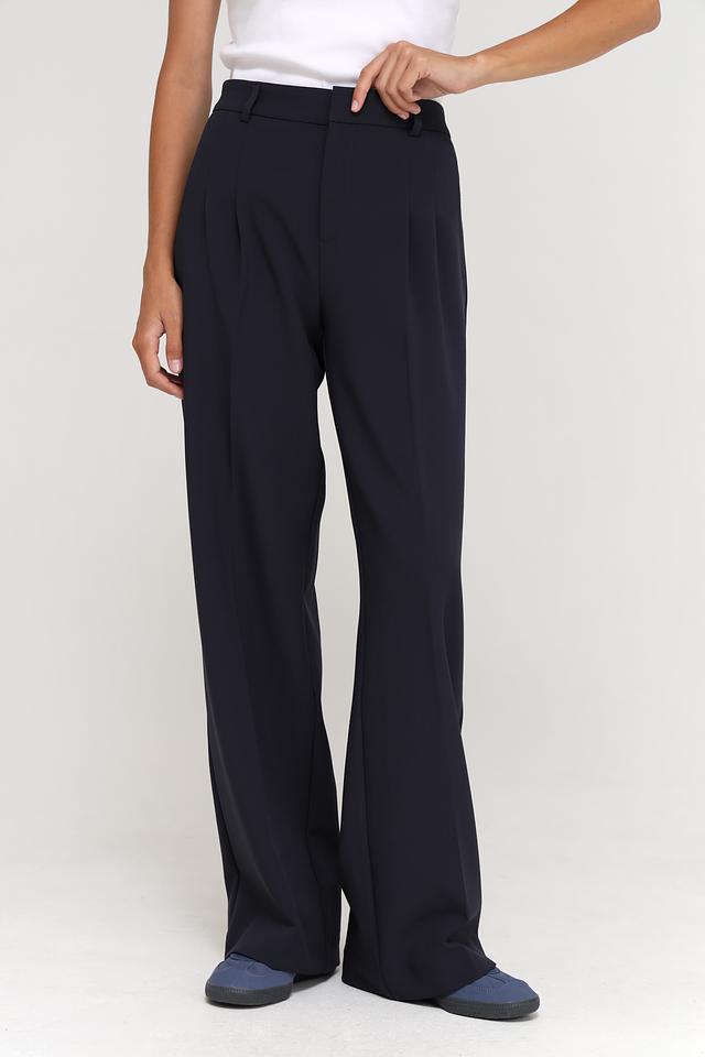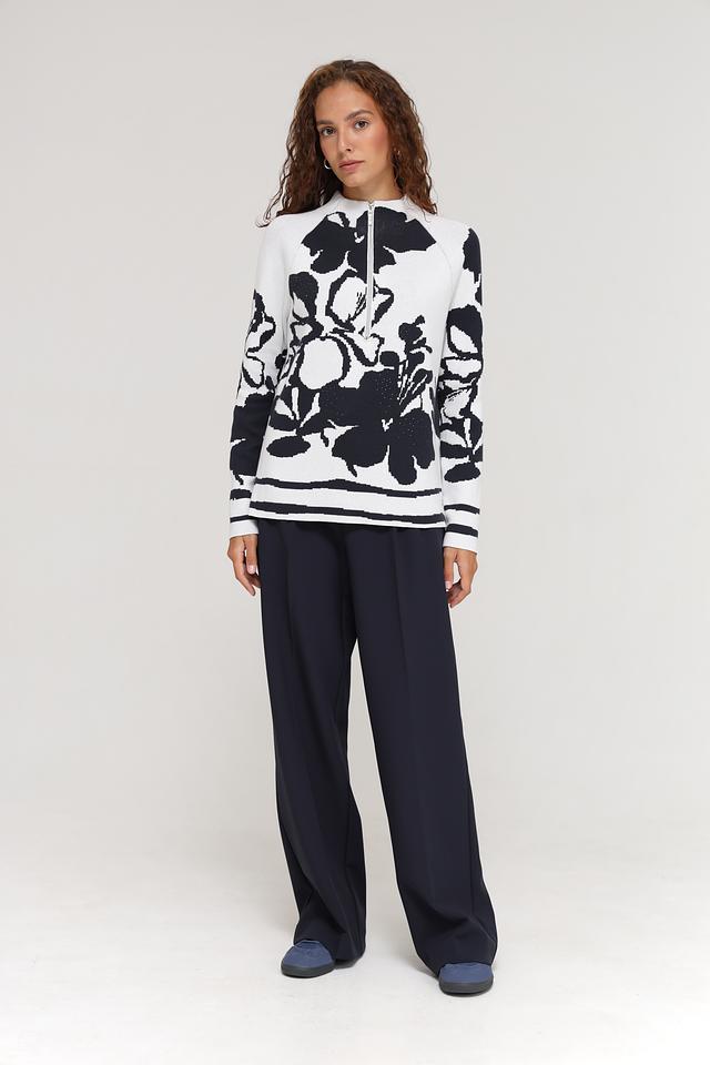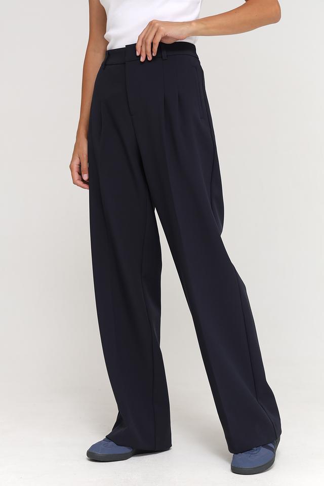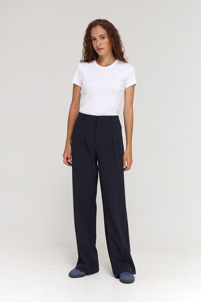 Брюки имеют прямой крой и высокую посадку, что визуально удлиняет ноги и подчеркивает талию. Передняя часть брюк оформлена защипами, что придает им более изысканный вид. Застежка – молния и пуговица.