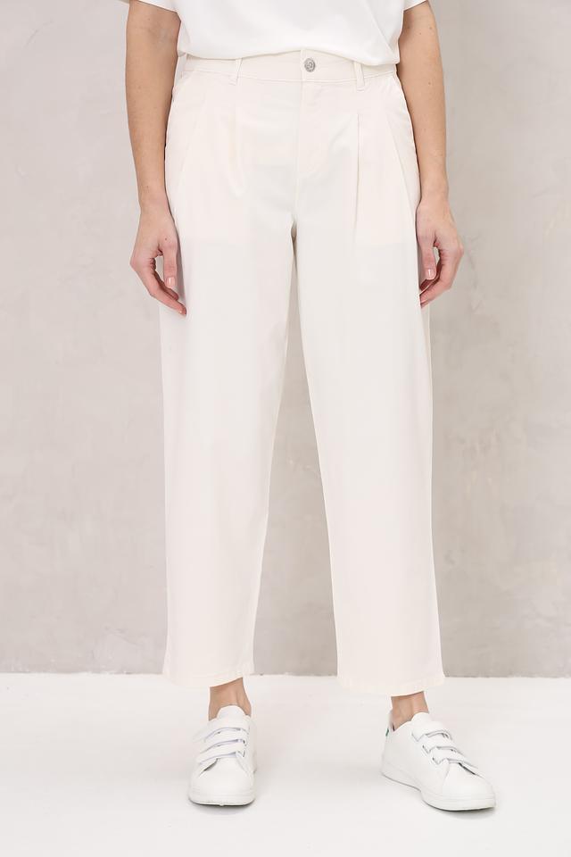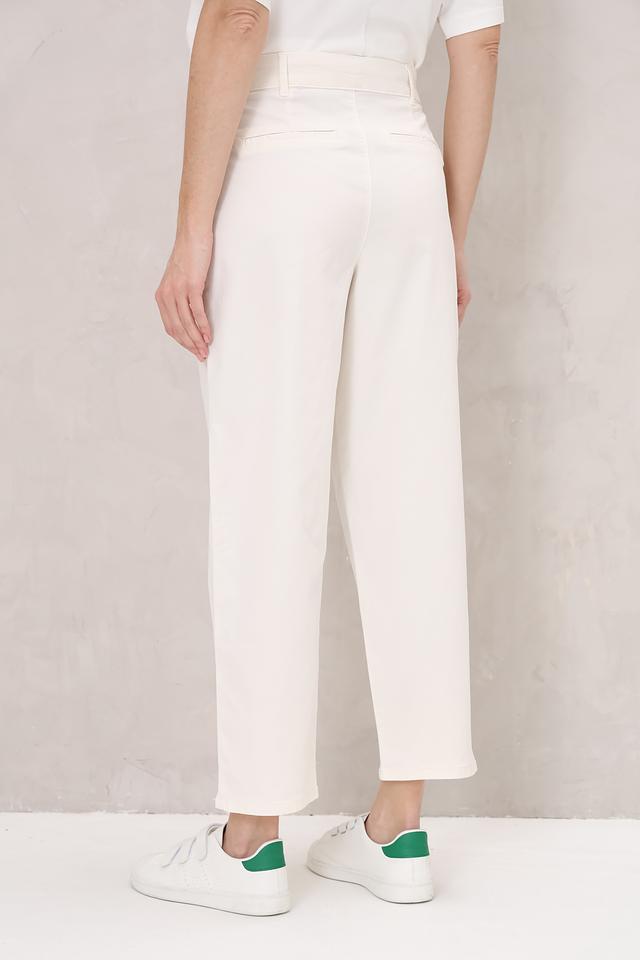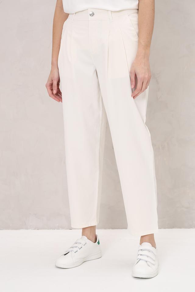 Брюки имеют прямой крой и высокую посадку, что обеспечивает комфортную посадку по фигуре и визуально удлиняет ноги. Спереди брюки украшены аккуратными складками, добавляющими им элегантности.