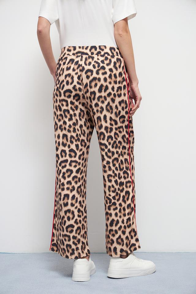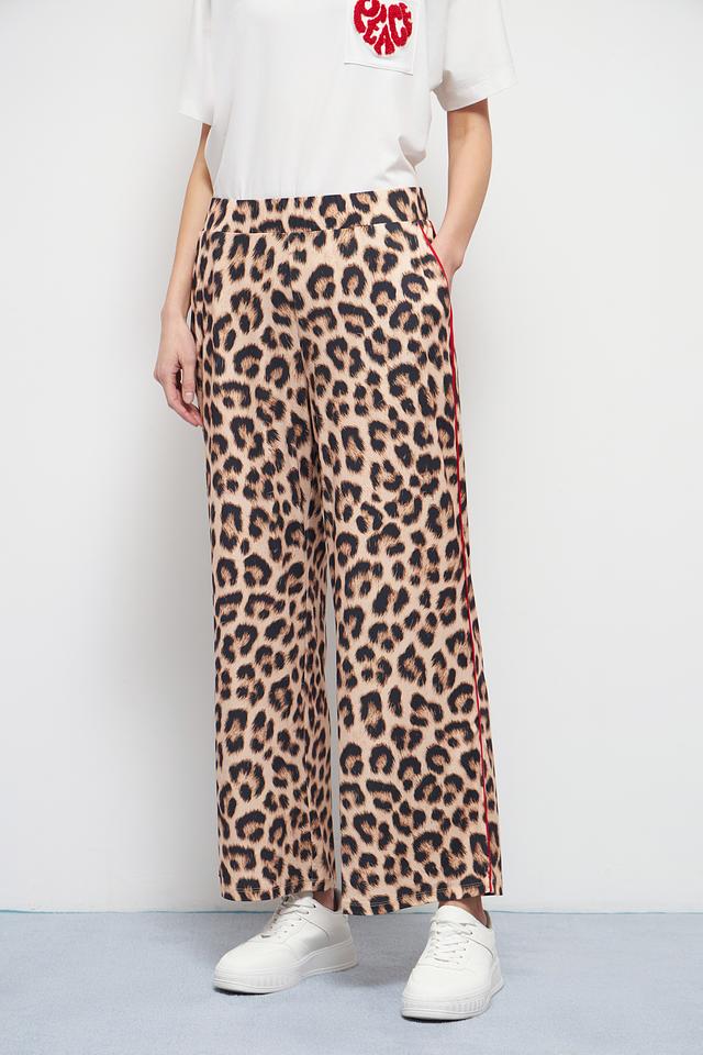 Женские брюки клёш от Oui в леопардовый принт с красной полосой по бокам. Модель выполнена из мягкой ткани с добавлением эластана для комфортной посадки и свободы движений. Состав: полиэстер 92%, эластан 8%