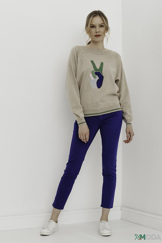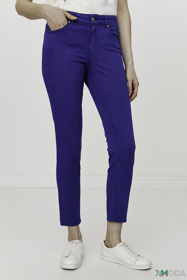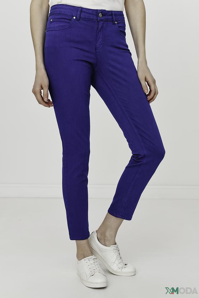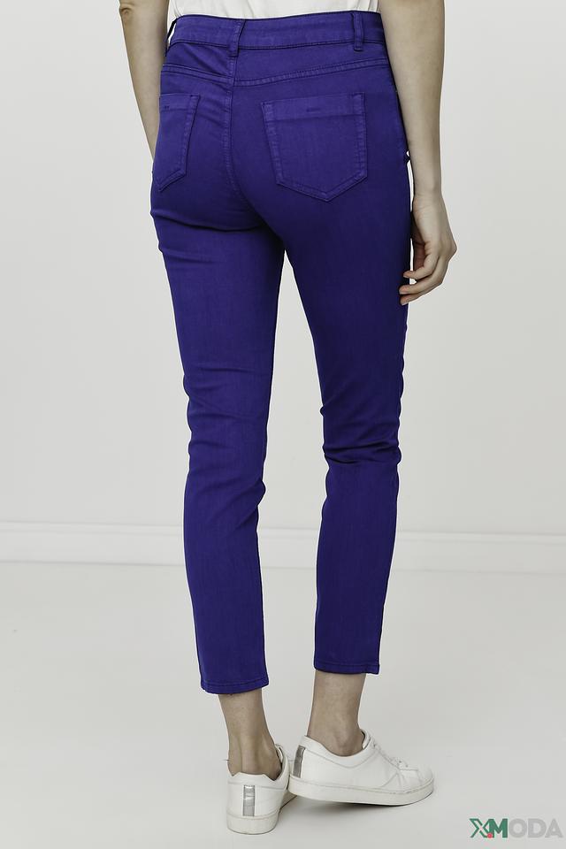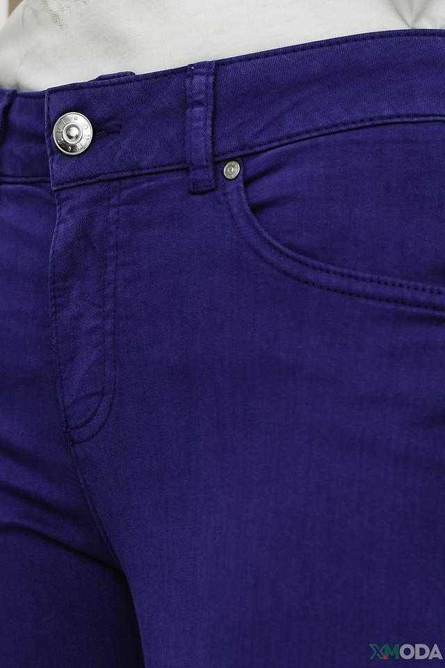 Брюки имеют классический синий цвет и плотную посадку по фигуре, подчеркивающую достоинства силуэта. Пять карманов – два спереди, два сзади и один небольшой карман для мелочи – делают модель практичной и функциональной.