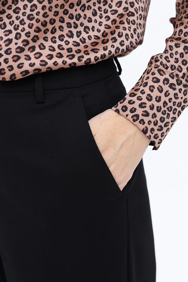 Брюки имеют прямой крой, обеспечивающий свободу движений и комфорт в течение всего дня. Высокая посадка визуально удлиняет ноги и подчеркивает талию. Застежка на молнию и пуговицу, а также боковые карманы добавляют функциональности.