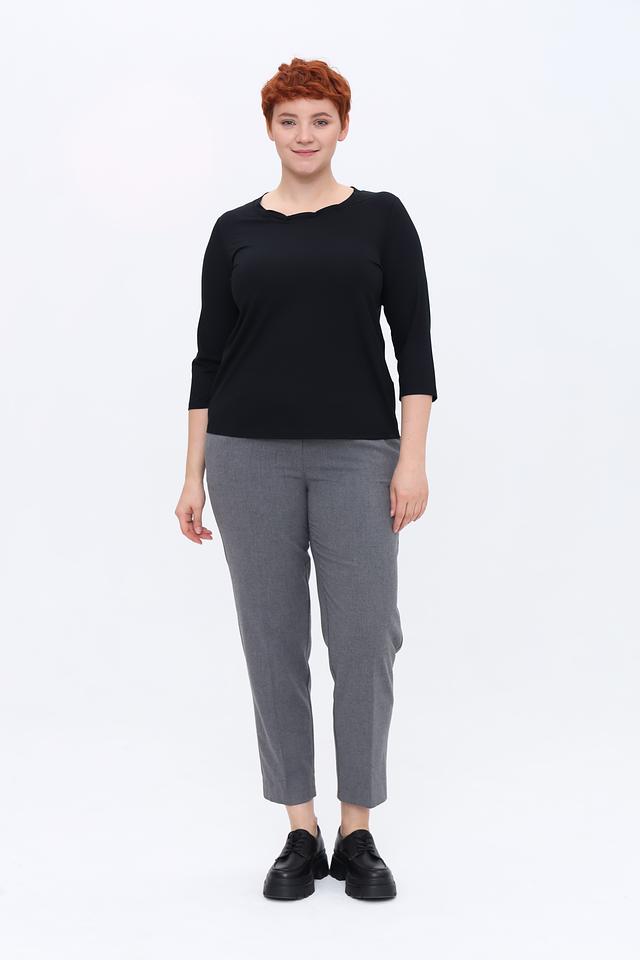 Брюки имеют прямой крой и эластичный пояс, обеспечивающий комфортную посадку по фигуре. Ткань, состоящая из полиэстера, вискозы и эластана, приятна к телу и хорошо держит форму.