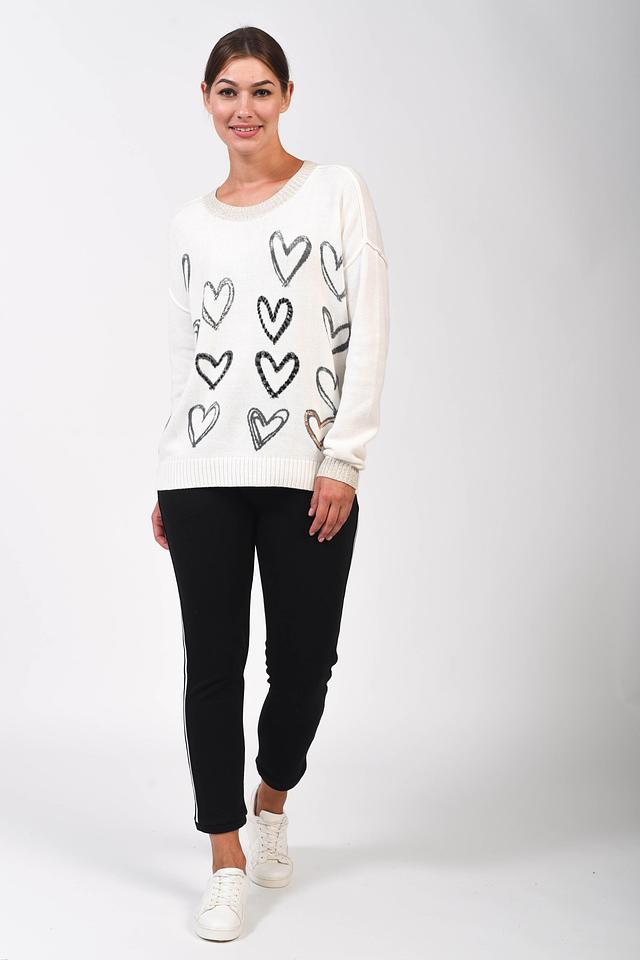 Брюки выполнены в классическом чёрном цвете и имеют прямой, слегка зауженный к низу крой. На боковой части брюк расположена контрастная белая полоска, добавляющая динамики образу. Декоративные элементы в виде небольших сердечек, украшенных стразами, придают брюкам изысканность.