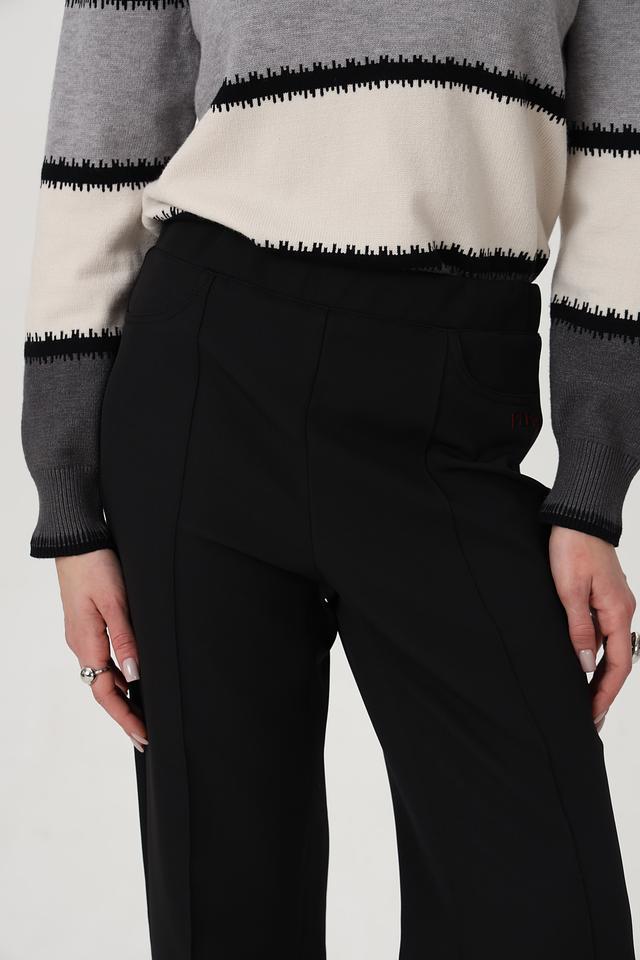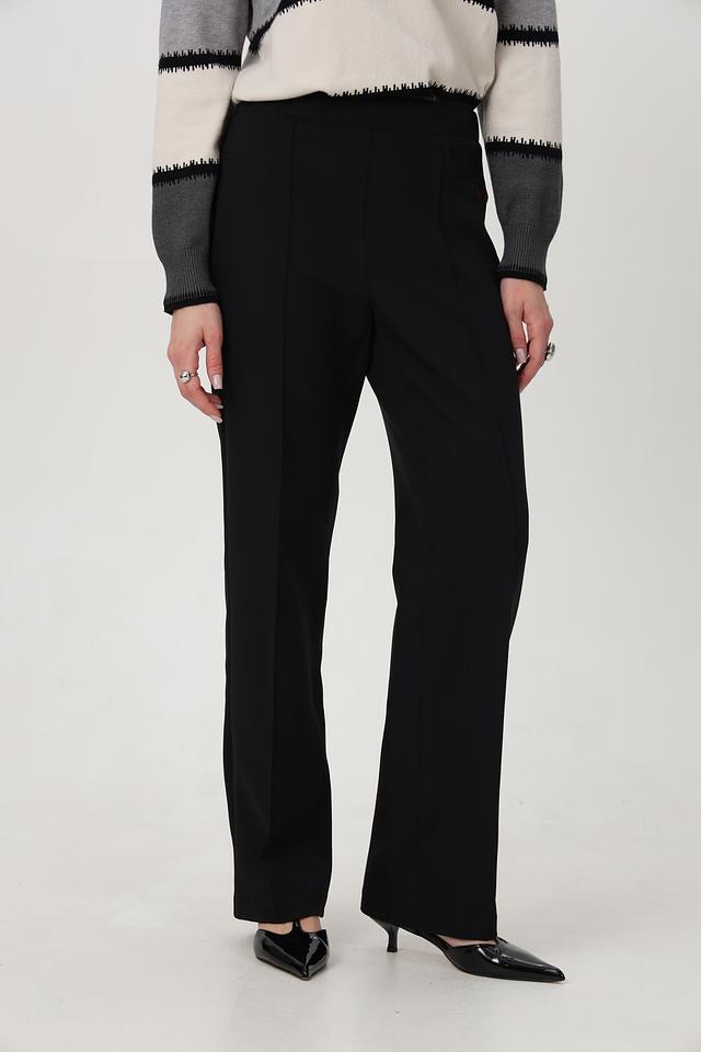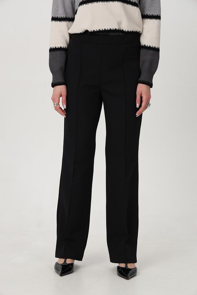 Брюки имеют прямой крой и высокую посадку, что визуально удлиняет ноги и создает элегантный силуэт. Ткань состоит из 91% полиэстера и 9% эластана, обеспечивая комфорт в носке и сохранение формы.