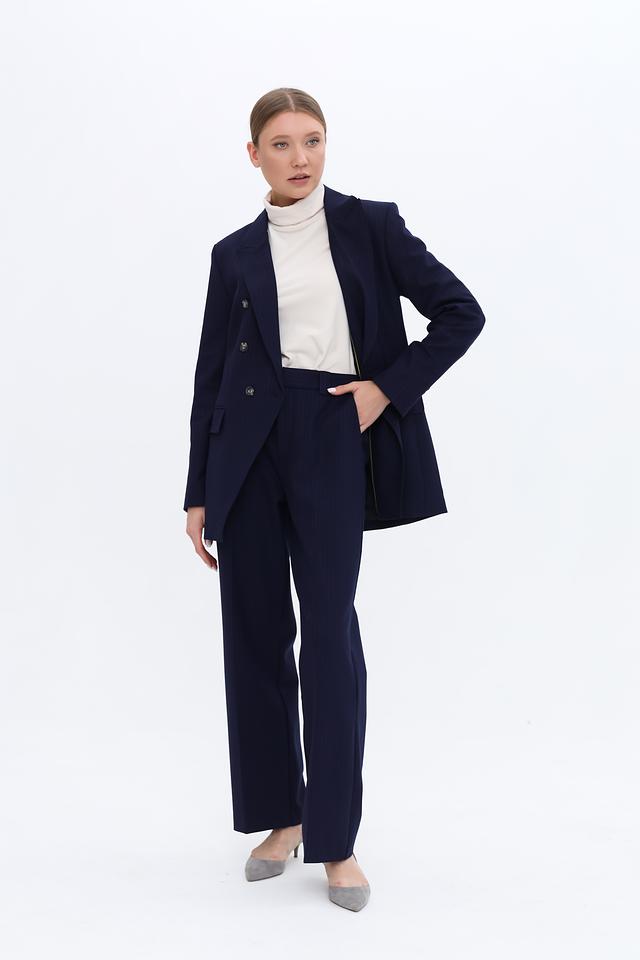 Представляем вашему вниманию классические брюки от бренда Rich and Royal. Эта модель выполнена в глубоком темно-синем цвете с деликатной вертикальной полоской, что придает ей особый шарм и элегантность.