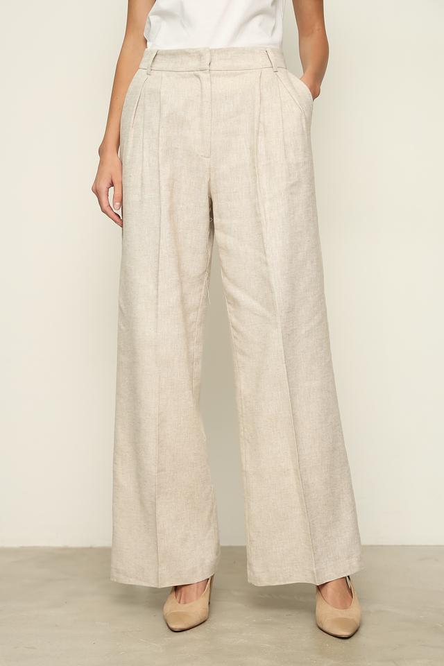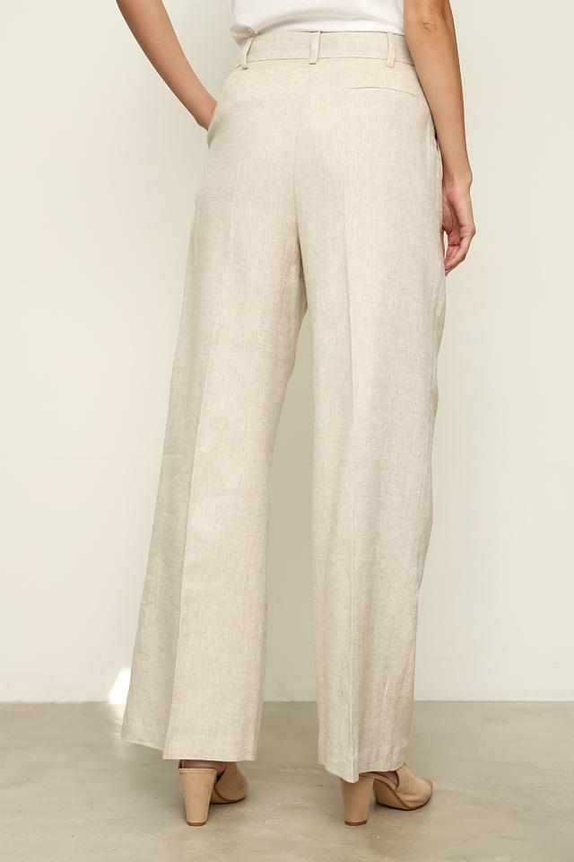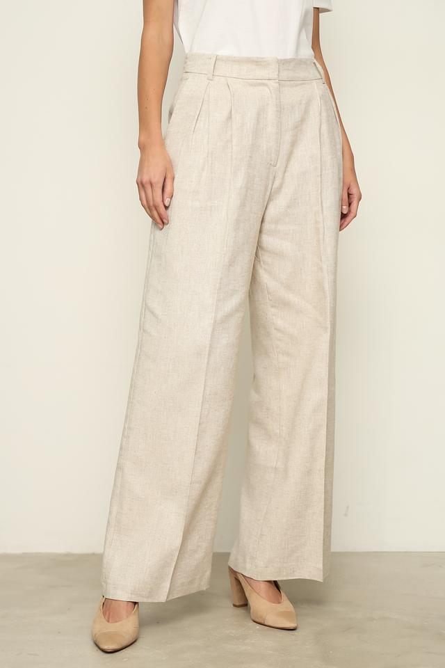 Брюки имеют свободный крой, широкие брючины и пояс с аккуратными защипами, что обеспечивает комфортную посадку и визуально удлиняет силуэт. Ткань состоит из 55% льна и 45% хлопка, что делает брюки приятными на ощупь и позволяет коже дышать.