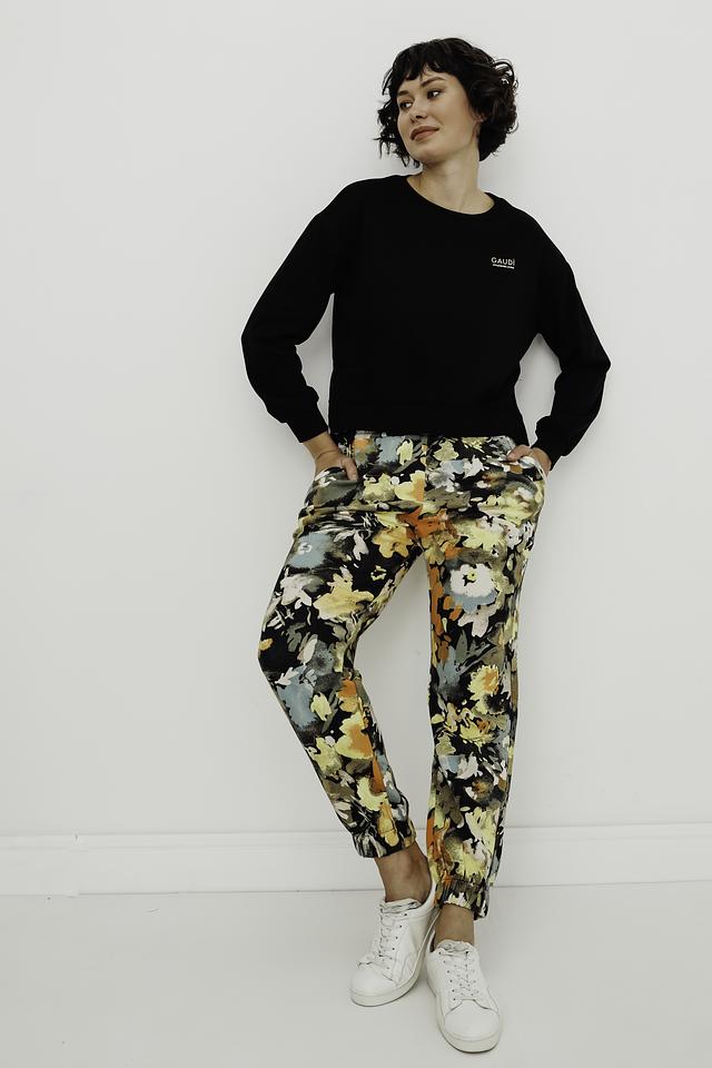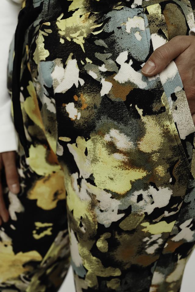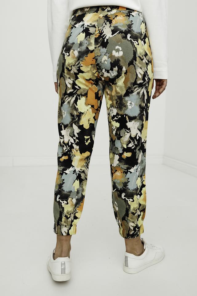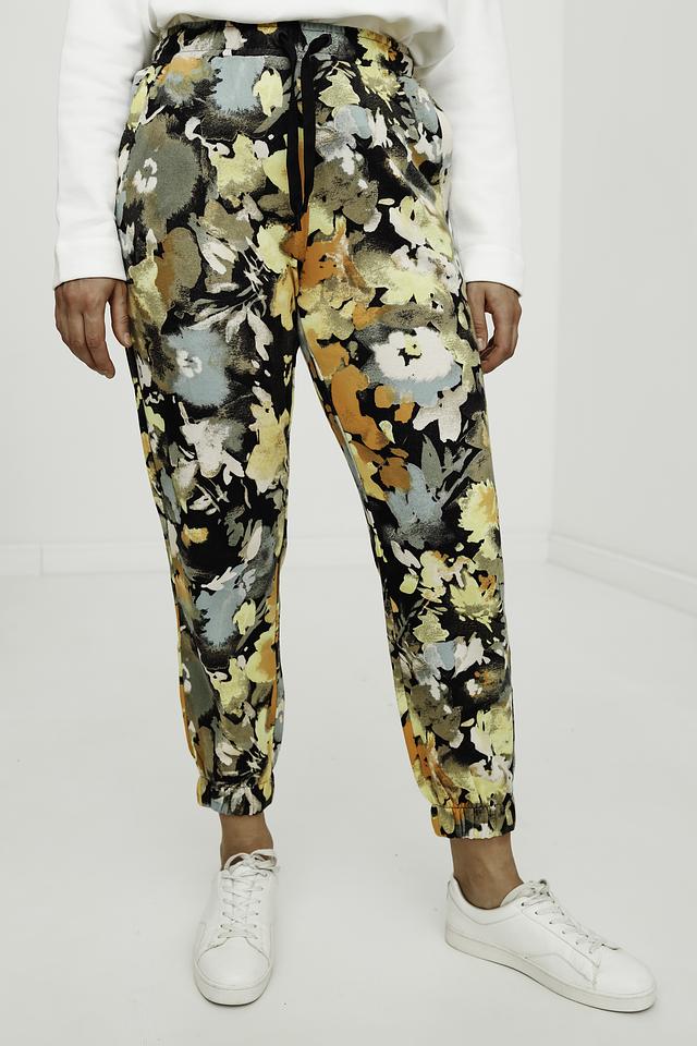 Брюки имеют оригинальный цветочный принт, сочетающий в себе оттенки оранжевого, жёлтого, голубого и чёрного. Удобный крой с эластичным поясом и манжетами внизу делает их идеальными для повседневной носки.