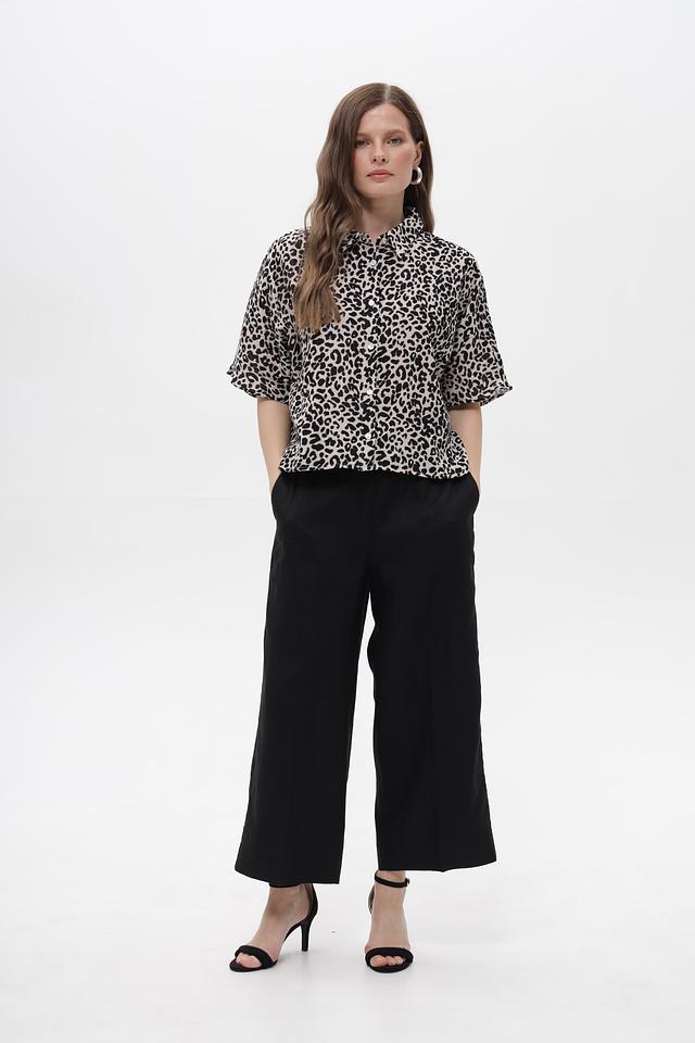 Брюки имеют свободный крой, который обеспечивает комфорт в носке и позволяет коже дышать. Высокая посадка визуально удлиняет ноги и подчеркивает талию. Широкие штанины создают элегантный силуэт и добавляют образу женственности.