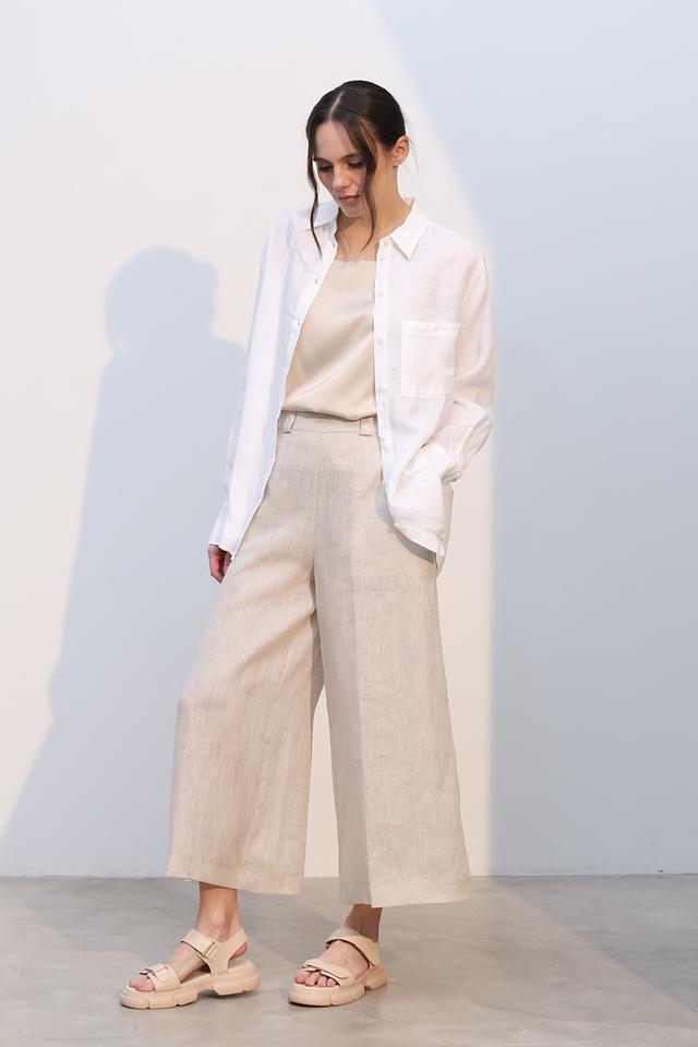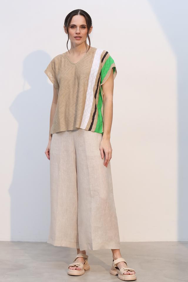 Брюки изготовлены из 100% льна, что делает их идеальным выбором для теплой погоды. Лен – это натуральный, дышащий материал, который обеспечивает приятные ощущения на коже и позволяет ей свободно дышать. Прямой крой брюк создает элегантный силуэт, а высокая посадка подчеркивает талию и визуально удлиняет ноги.