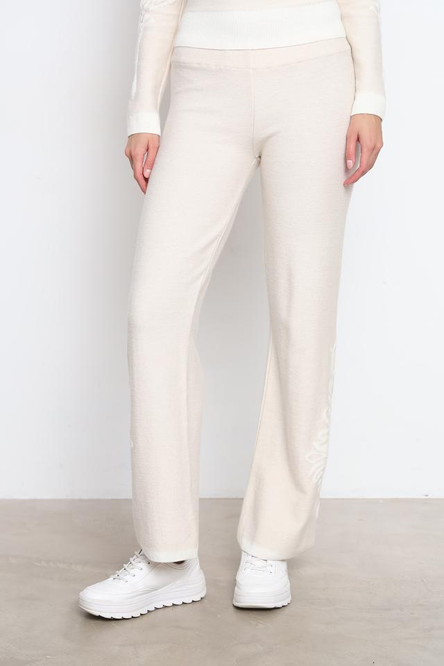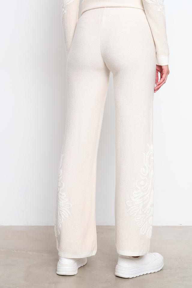 Особенностью данной модели является декоративный вязаный узор, расположенный по боковой части брюк, что придает им изысканность и оригинальность. Прямой крой и высокая посадка подчеркивают фигуру и обеспечивают свободу движений. Брюки идеально подойдут для создания как повседневных, так и более нарядных образов.