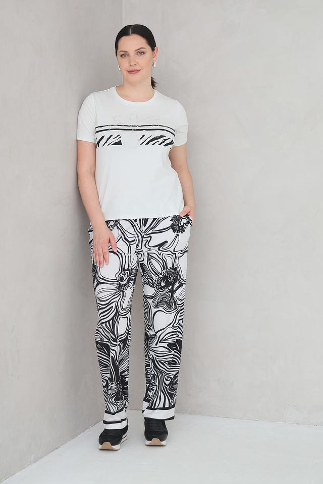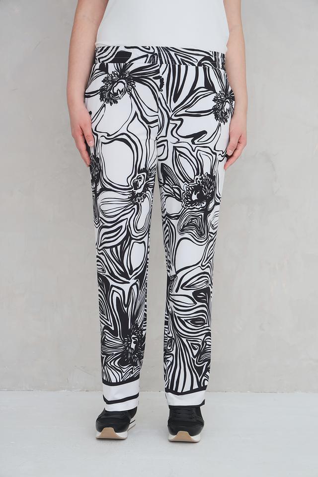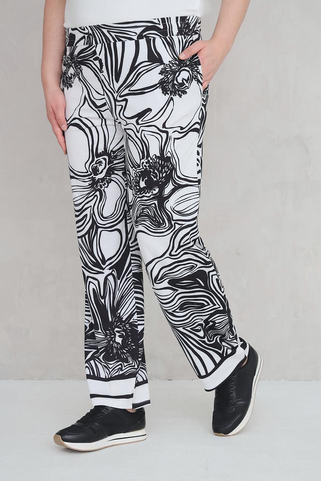 Брюки выполнены в контрастном чёрно-белом цвете и украшены эффектным цветочным принтом, который придает им особый шарм и индивидуальность. Принт выполнен в виде абстрактных цветочных мотивов, создающих динамичный и современный образ.