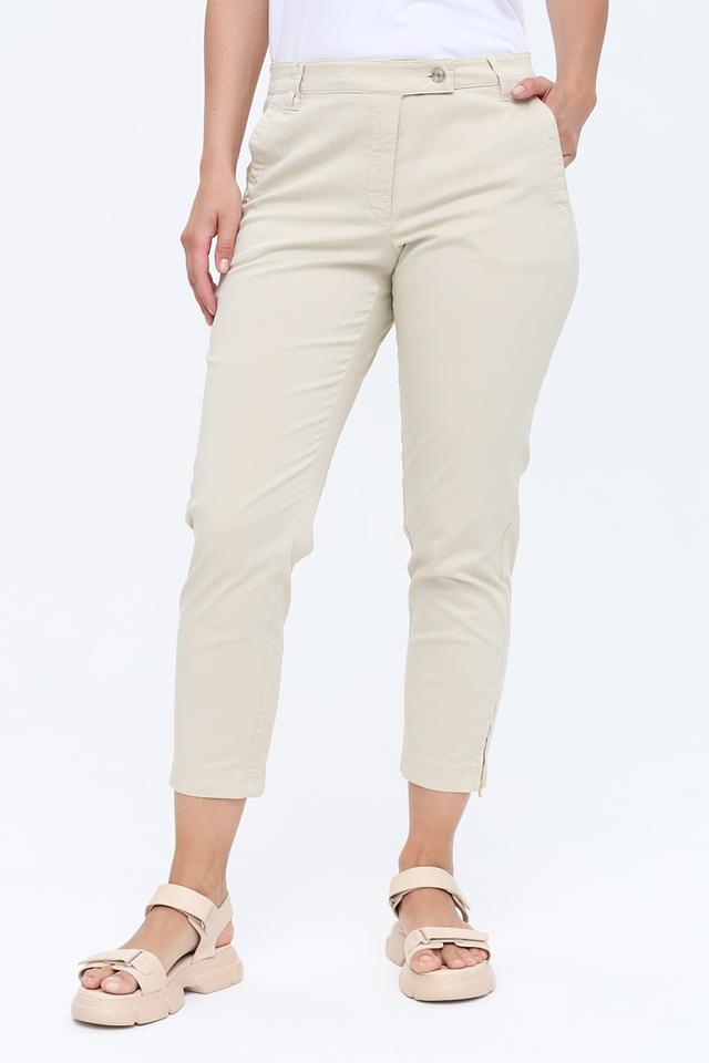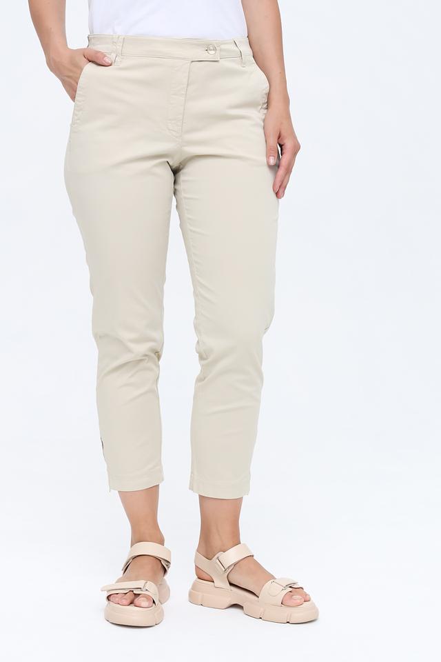 Брюки имеют классический крой и нейтральный бежевый цвет, который легко сочетается с различными элементами одежды. Декоративная молния на щиколотке придает брюкам современный и стильный вид.