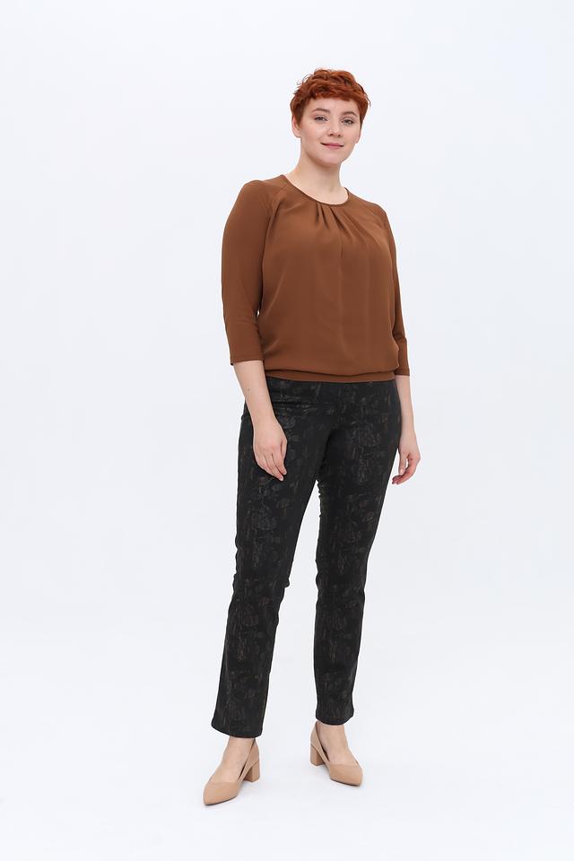 Брюки имеют классический крой с зауженными к низу штанинами, что визуально удлиняет ноги и делает силуэт более стройным. Высокая посадка обеспечивает комфортную посадку по фигуре и подчеркивает талию. Застежка на молнию и пуговицу.