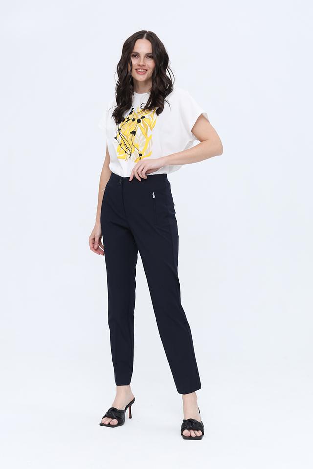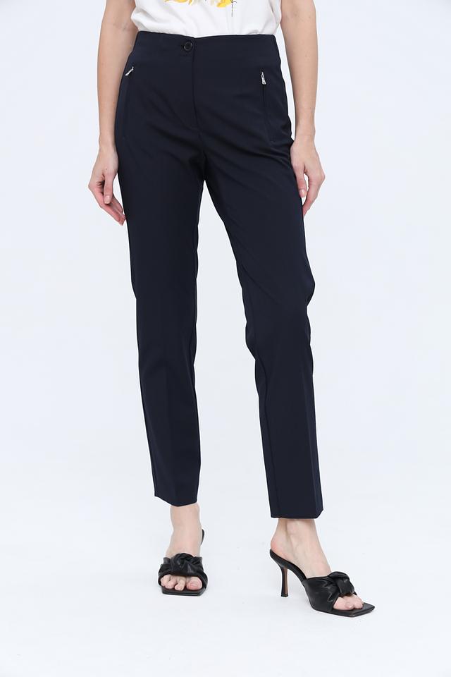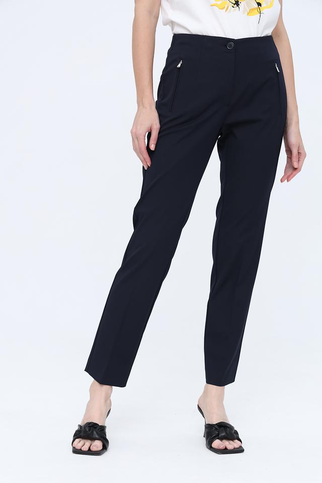 Цвет брюк – насыщенный темно-синий, который легко сочетается с различными цветами и стилями одежды. Модель дополнена аккуратными молниями на карманах, что придает ей современный вид. Брюки идеально подойдут для офиса, деловых встреч или повседневной носки.