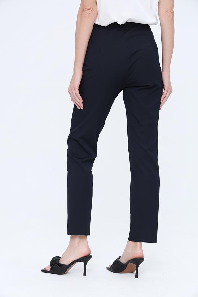 Брюки имеют прямой крой и стандартную посадку по талии. Ткань, из которой они изготовлены, сочетает в себе полиэстер (55%), вискозу (38%) и эластан (7%). Благодаря этому составу, брюки хорошо держат форму, приятны к телу и обладают небольшим эффектом утяжки.