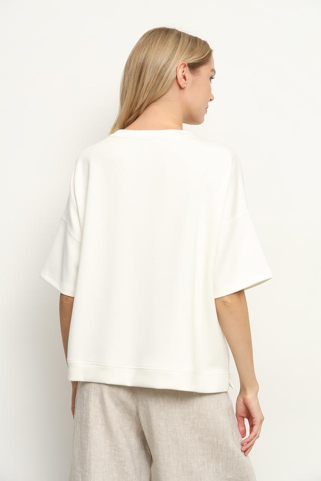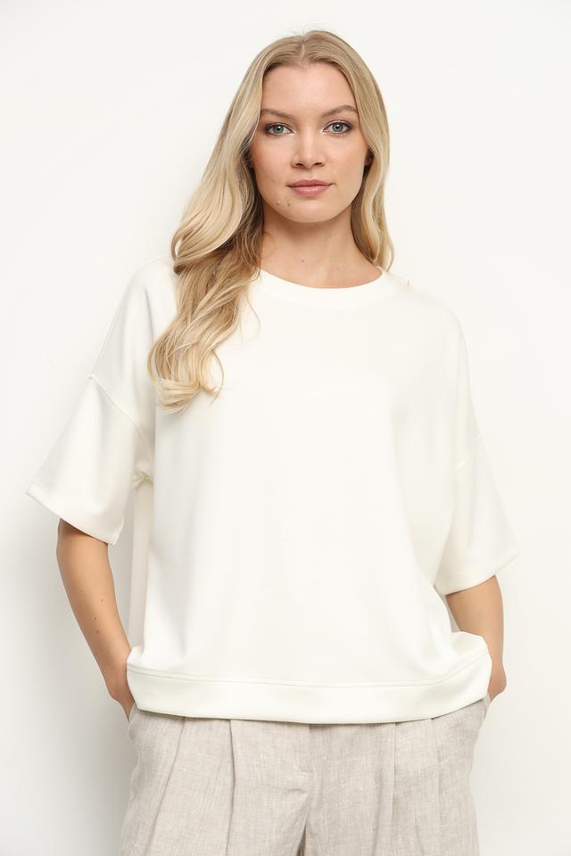 Модель отличается короткими рукавами с небольшим спущенным плечом, что придает ей современный и непринужденный вид. Блуза изготовлена из высококачественного модала, полиэстера и эластана, что делает ее приятной к телу и устойчивой к деформации.