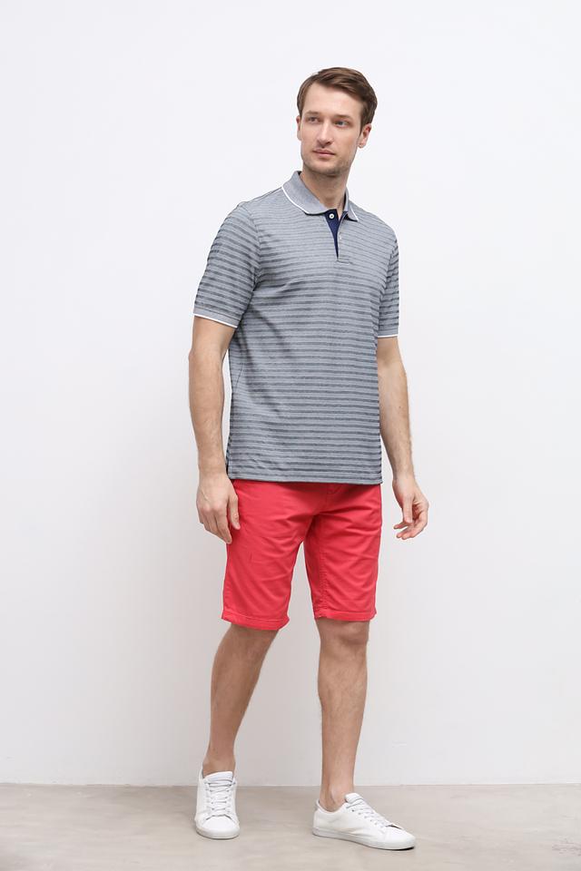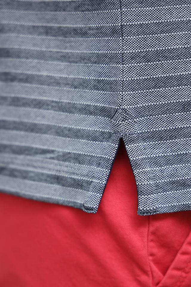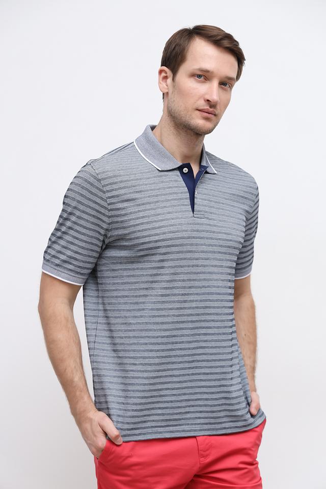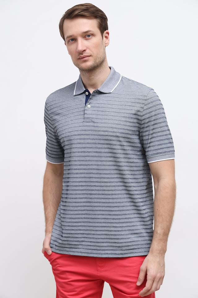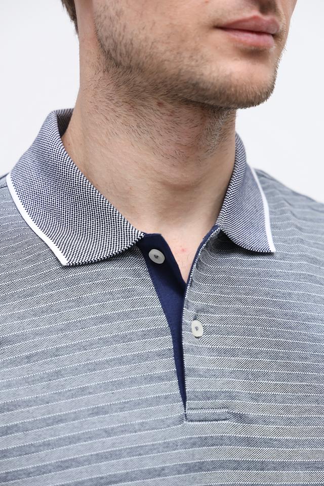 Поло имеет классический крой, короткие рукава и воротник на пуговицах. Отличительной особенностью является контрастная синяя планка и воротник с белой окантовкой, а также оригинальный рисунок в мелкую полоску. Такой дизайн делает поло универсальным и подходящим для различных стилей.