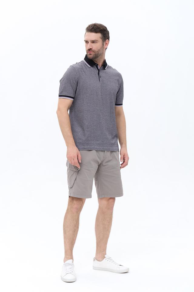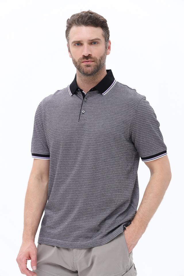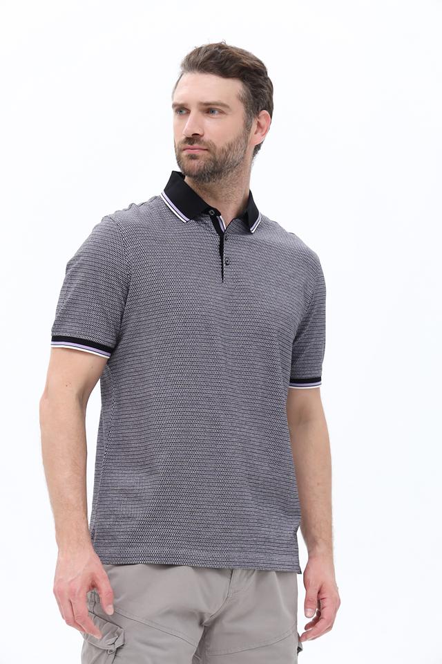 Отличительной особенностью данной модели является сочетание серого цвета с белым и черным принтом, а также контрастная черная отделка воротника и манжет. Это поло идеально подойдет для повседневной носки, а также для создания более формальных образов.