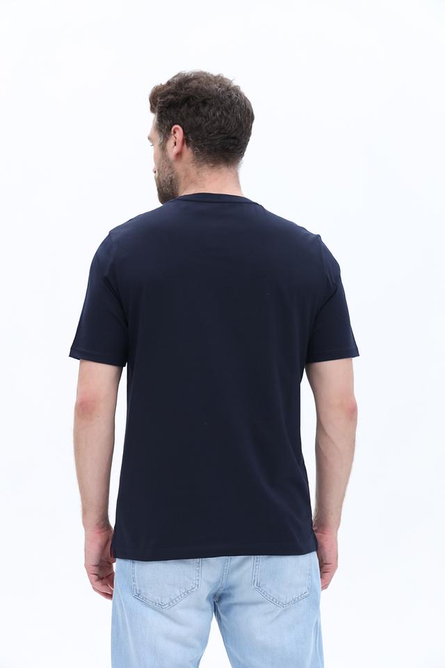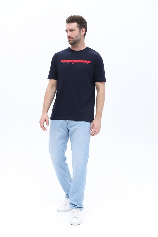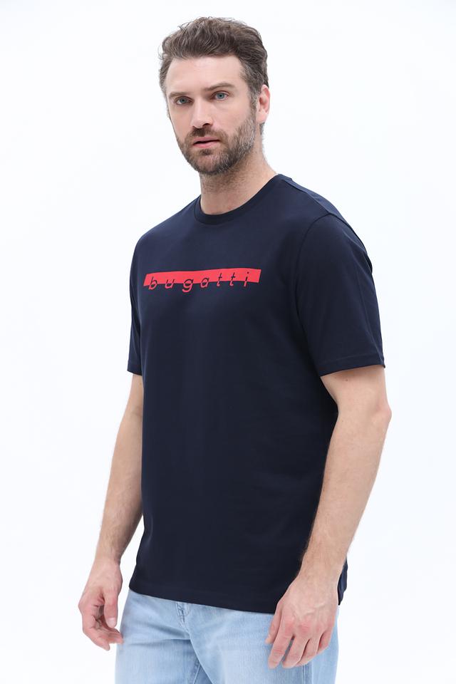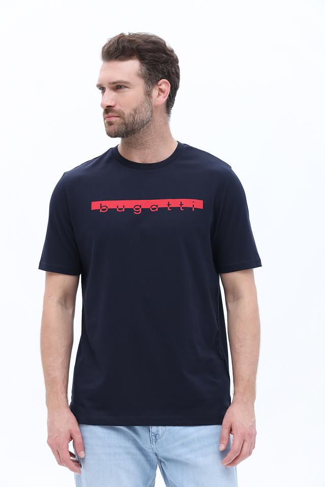 Мужская футболка Bugatti темно-синего цвета с красным логотипом на груди. Изготовлена из 100% хлопка, обеспечивающего комфорт и воздухопроницаемость. Состав: хлопок 100%