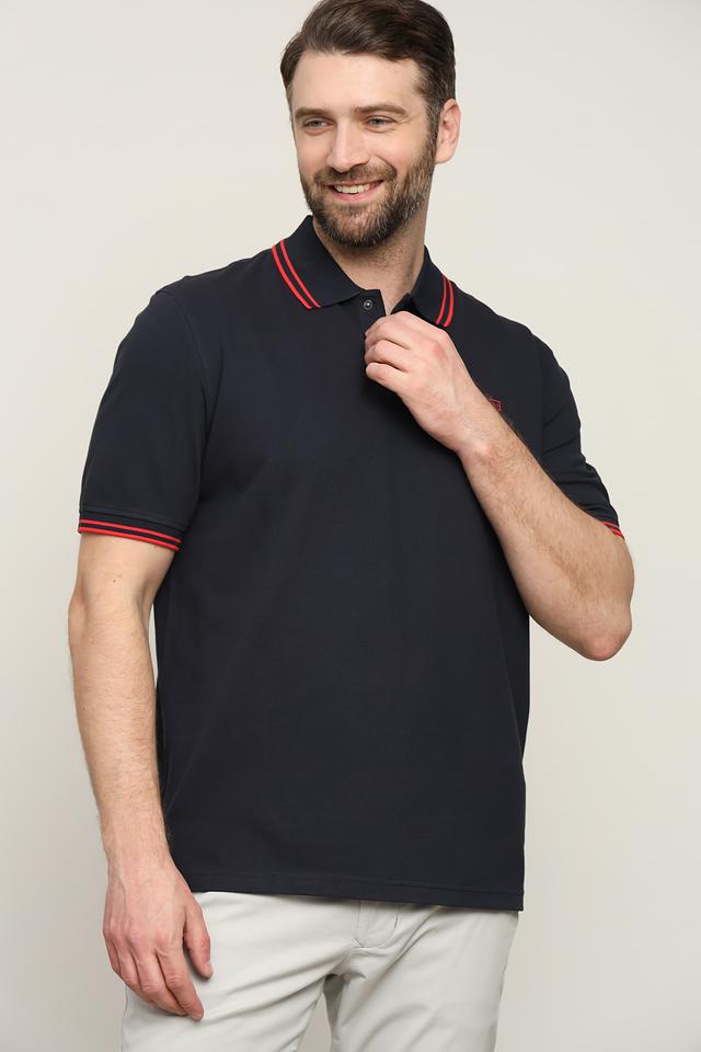 Мужское поло Bugatti тёмно-синего цвета с красной отделкой на воротнике и рукавах. Классический крой и качественный состав обеспечивают комфорт и долговечность. Состав: хлопок 96%, эластан 4%