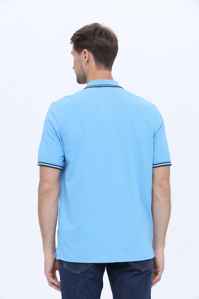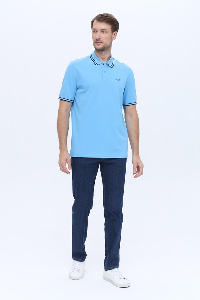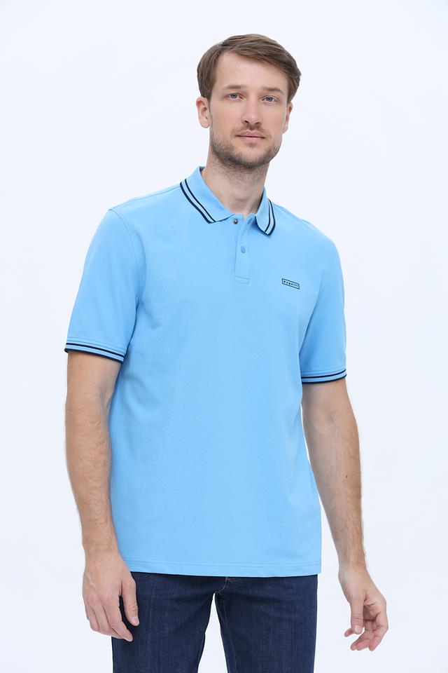 Голубое поло Bugatti с коротким рукавом и контрастным кантом на воротнике и рукавах. Изготовлено из мягкого хлопка с добавлением эластана для комфорта и сохранения формы. Состав: хлопок 96%, эластан 4%