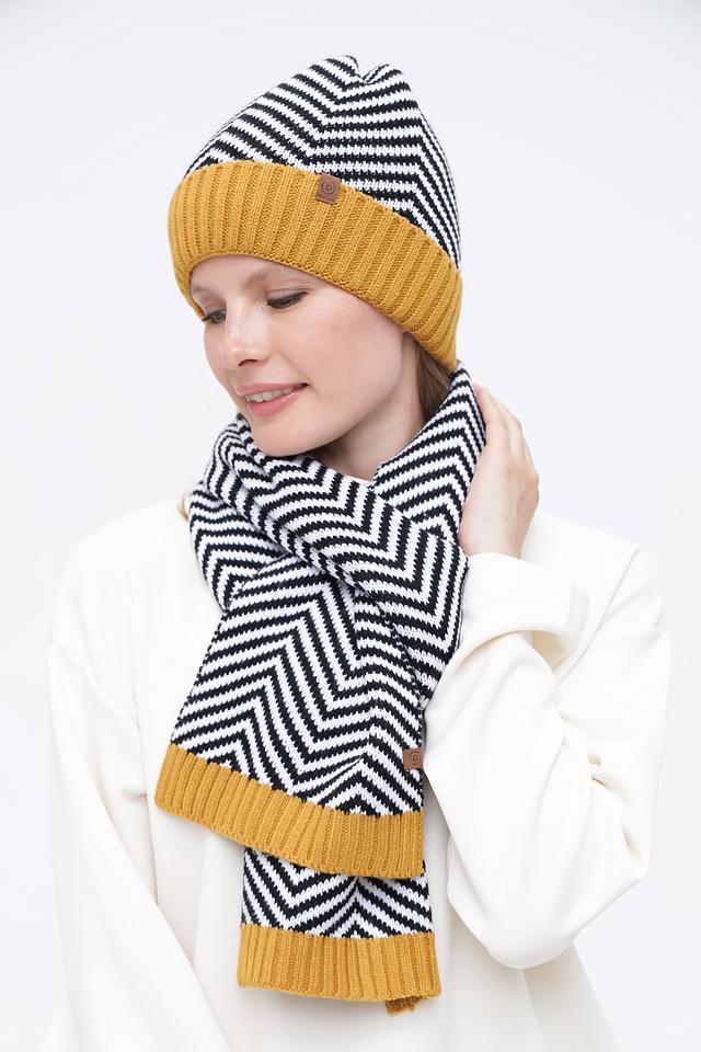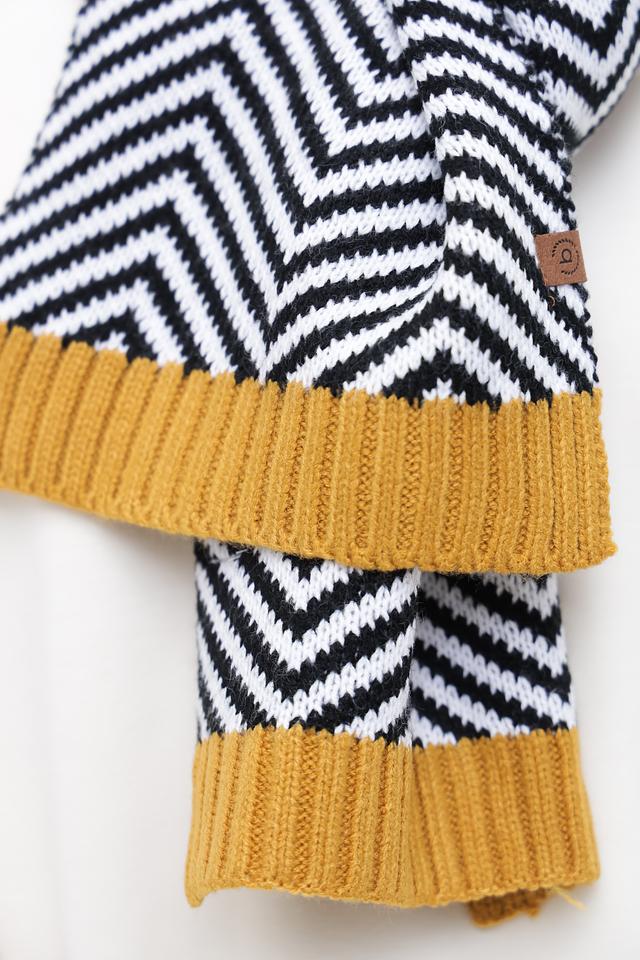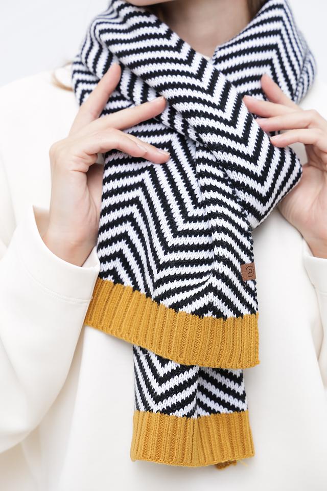 Дизайн шарфа выполнен в виде выразительного геометрического узора, который придаёт ему оригинальность и позволяет сочетать с различными стилями одежды. Горчичный цвет отлично гармонирует с нейтральными оттенками, а чёрно-белая полоска добавляет динамики и контраста.