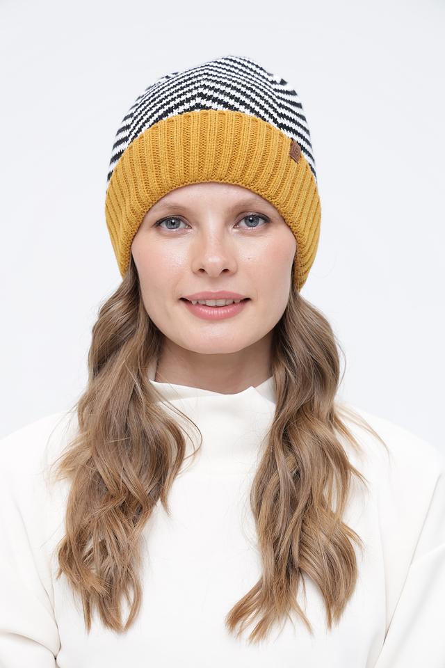 Шапка выполнена из 100% полиакрила – материала, который хорошо сохраняет тепло, не вызывает аллергии и прост в уходе. Верхняя часть шапки выполнена в черно-белую полоску, а нижняя часть – горчичного цвета, создавая интересный контраст.