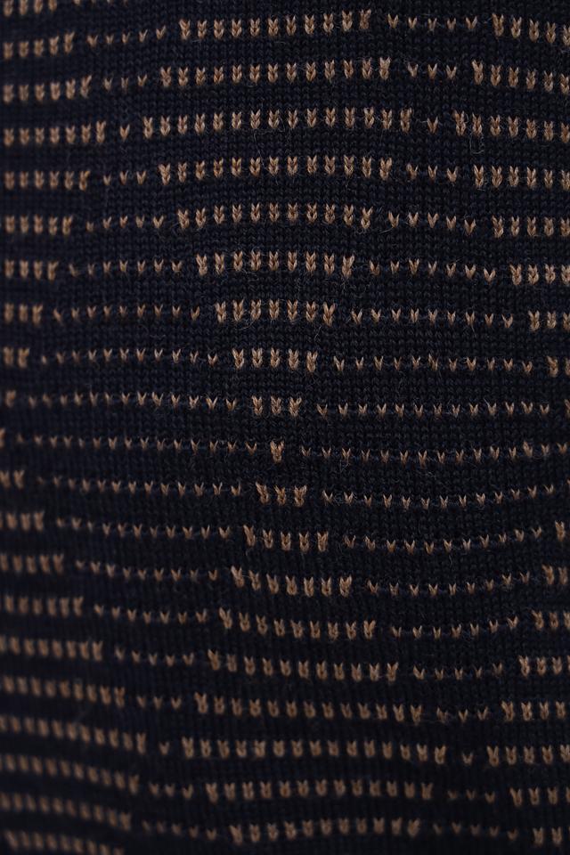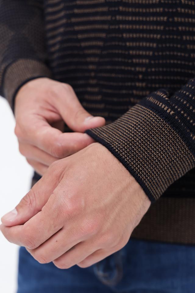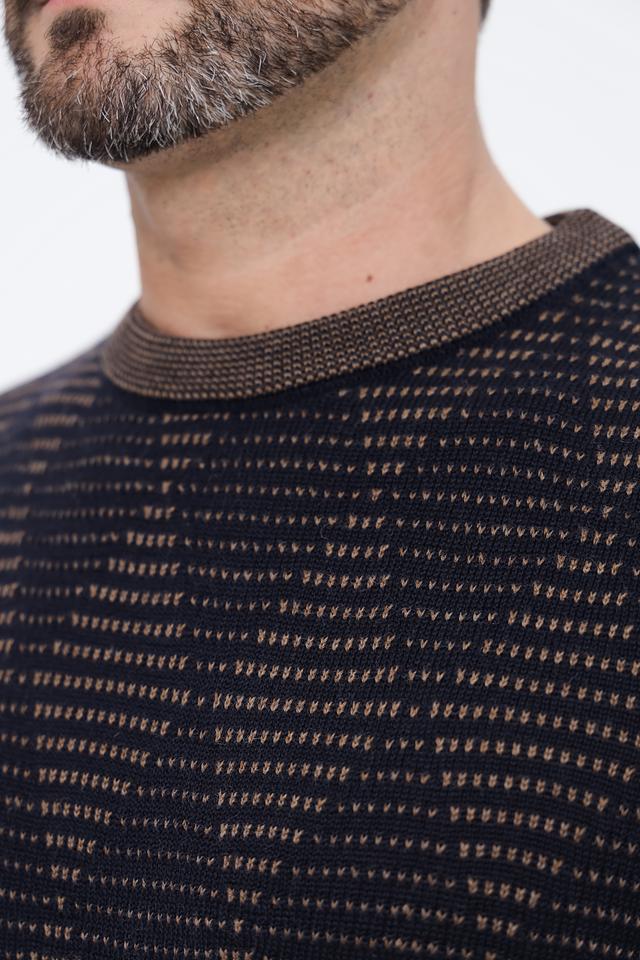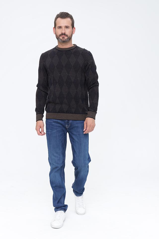 Основной цвет джемпера – чёрный, который дополнен выразительным узором, выполненным в коричневых тонах. Такое сочетание делает изделие универсальным и подходящим для создания различных образов. Горловина и низ джемпера отделаны коричневой резинкой, что придает ему завершенный вид.