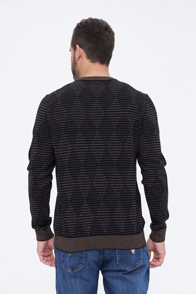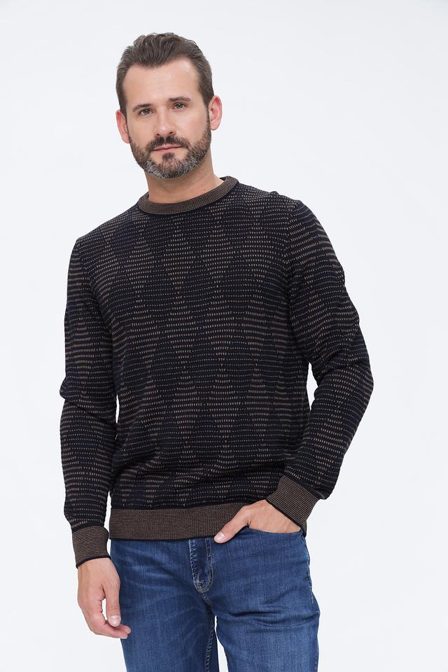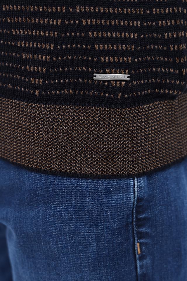 Мужской джемпер Bugatti чёрного цвета с оригинальным узором и коричневой отделкой. Изготовлен из мягкой и приятной на ощупь смеси шерсти и полиакрила, обеспечивающей комфорт и тепло. Состав: шерсть 50%, полиакрил 50%