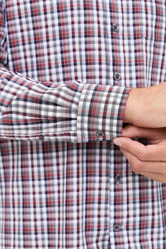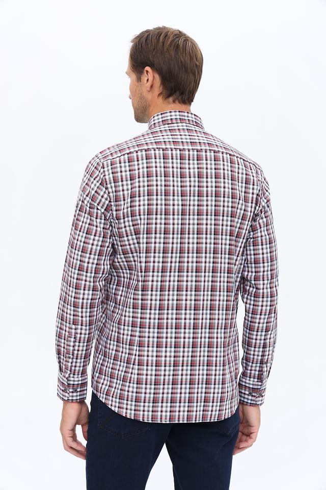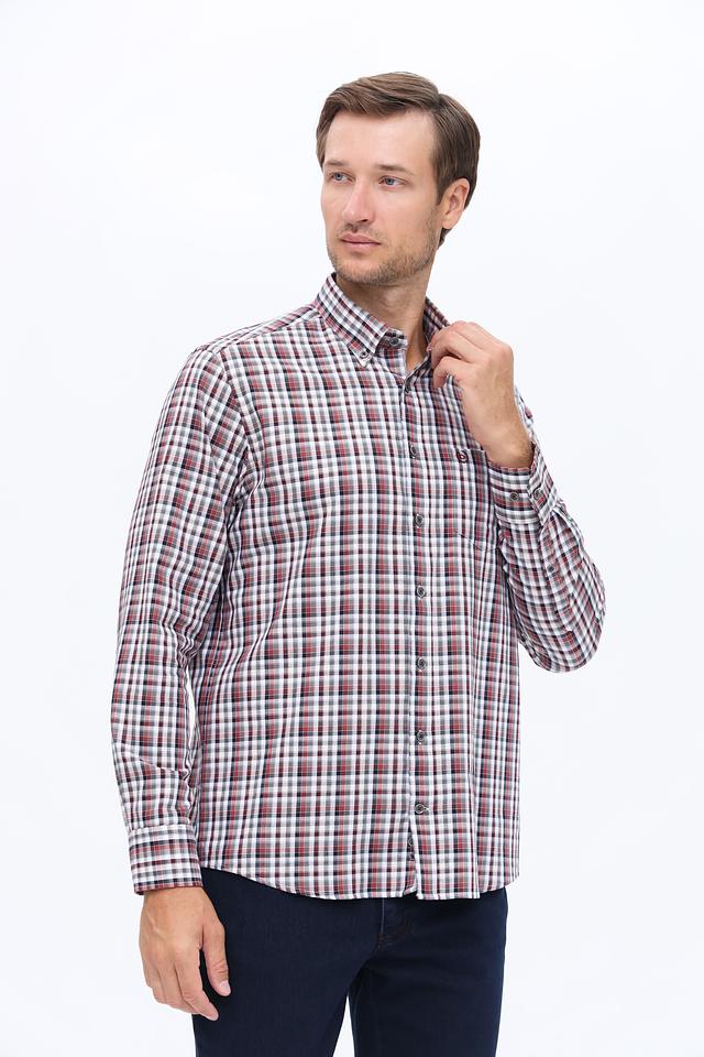Основной цвет рубашки – белый, но благодаря клетчатому рисунку в сочетании красного, синего и черного цветов, она выглядит динамично и интересно. Клетка придает рубашке особый шарм и делает ее универсальной для различных образов.
