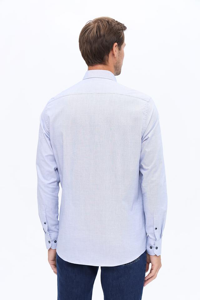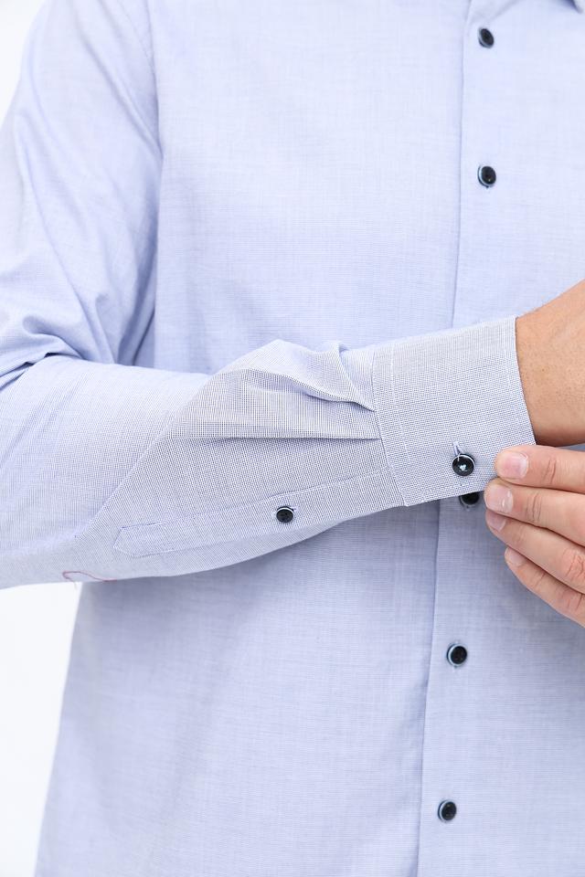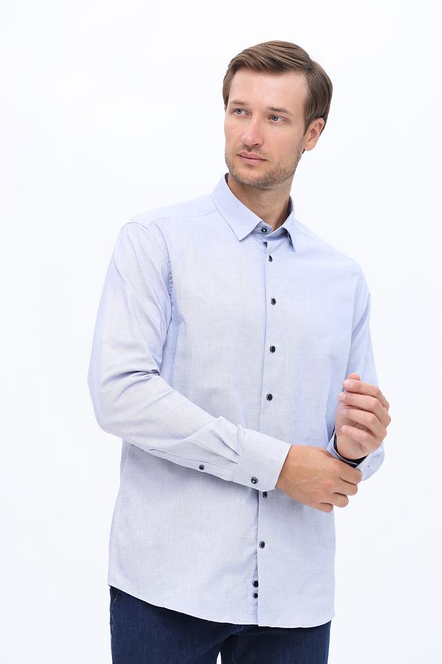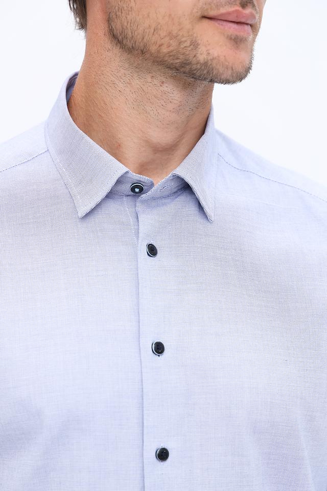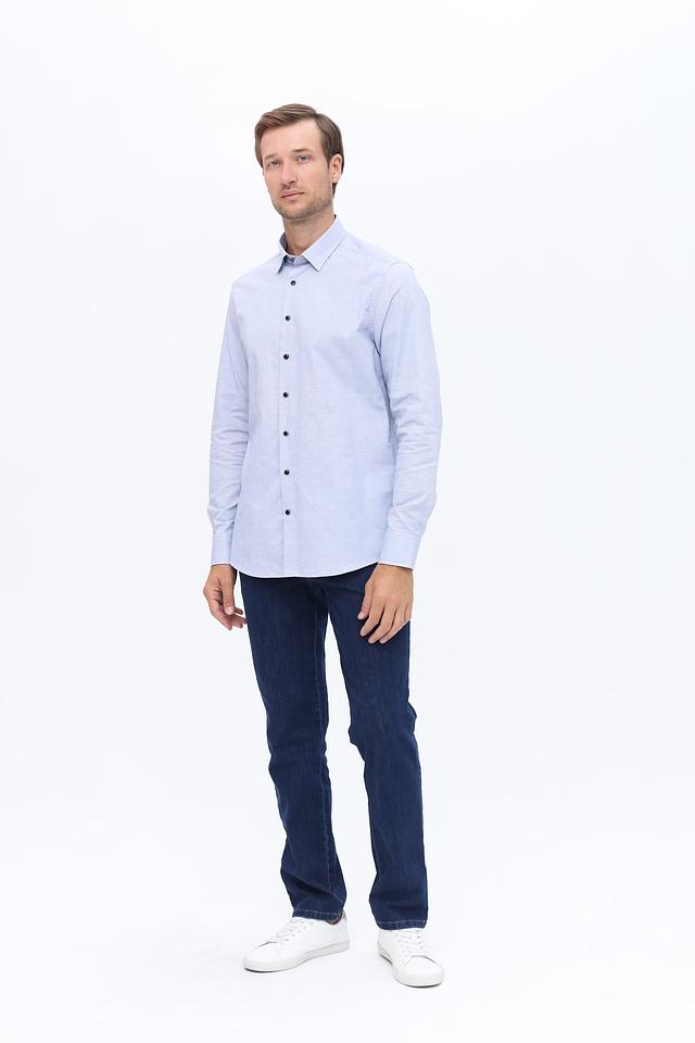Рубашка имеет классический крой с приталенным силуэтом, который подчеркивает фигуру и обеспечивает свободу движений. Голубой цвет с мелким рисунком придает ей свежий и современный вид. Застежка на пуговицах выполнена в тон рубашке, что создает гармоничный образ.
