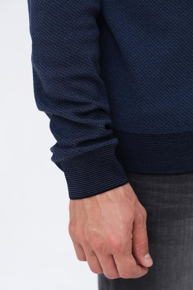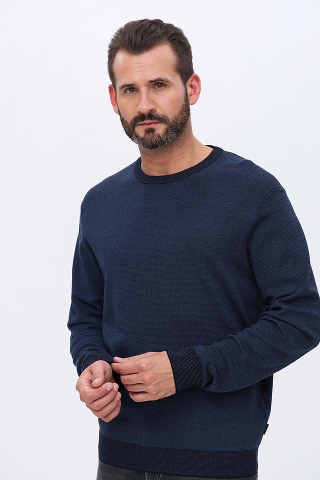 Мужской джемпер Bugatti синего цвета с выраженной текстурой выполнен из мягкого сочетания шерсти и полиакрила. Модель имеет классический крой и круглый вырез горловины, а манжеты и нижний край оформлены плотной резинкой. Состав: шерсть 50%, полиакрил 50%