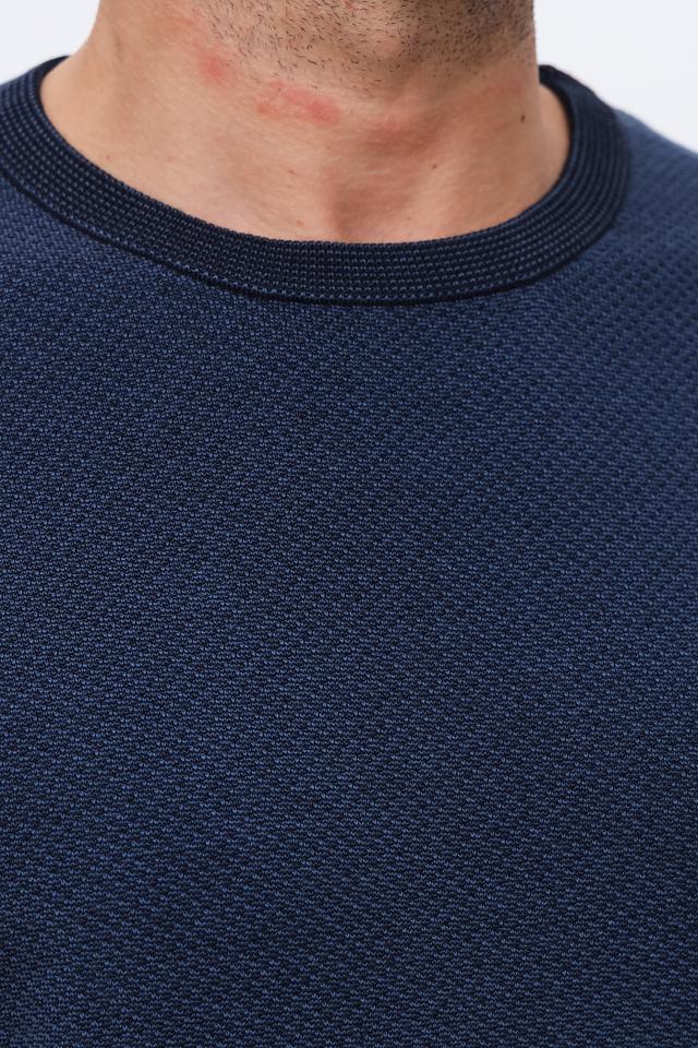 Джемпер имеет насыщенный синий цвет и оригинальную текстуру вязки, которая придает ему особый шарм. Классический крой и круглый вырез горловины делают его универсальным для различных стилей и случаев.