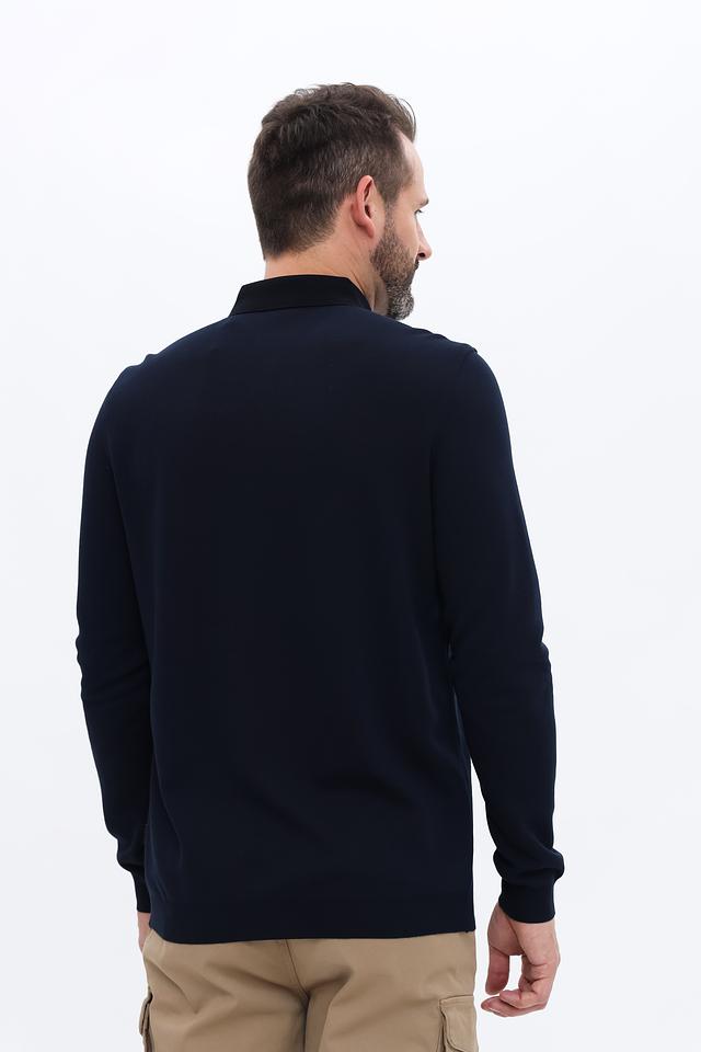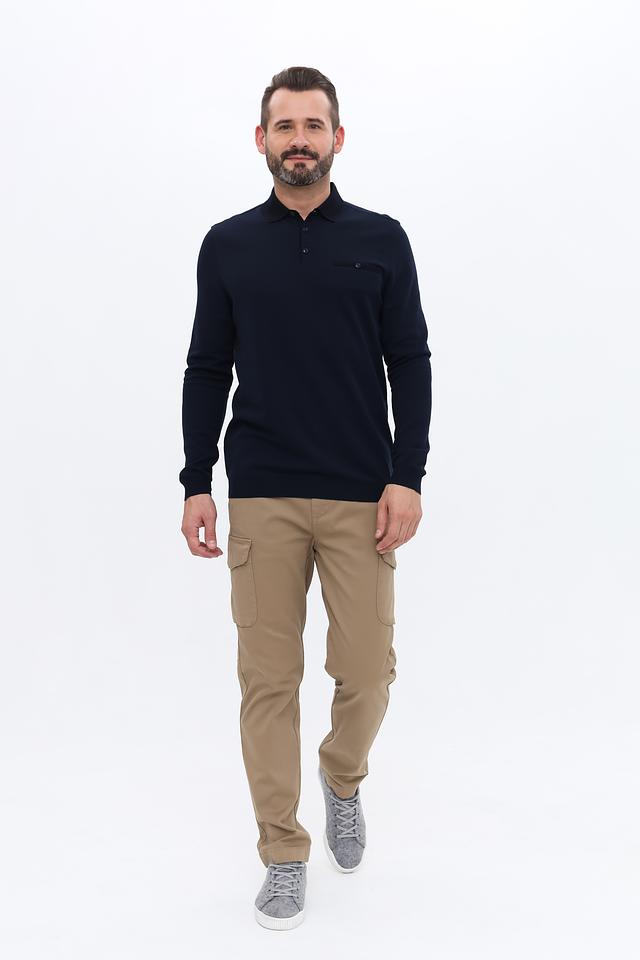 Мужской джемпер Bugatti тёмно-синего цвета с воротником-поло и длинными рукавами. Изготовлен из сочетания полиэстера и хлопка, обеспечивая комфорт и практичность. Отличается лаконичным дизайном и удобной посадкой. Состав: полиэстер 70%, хлопок 30%