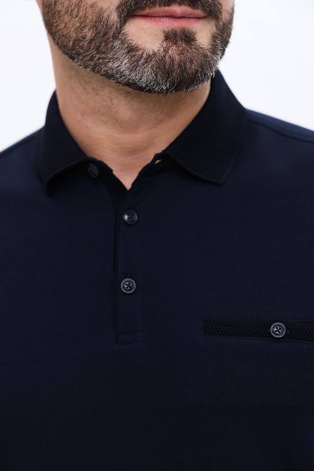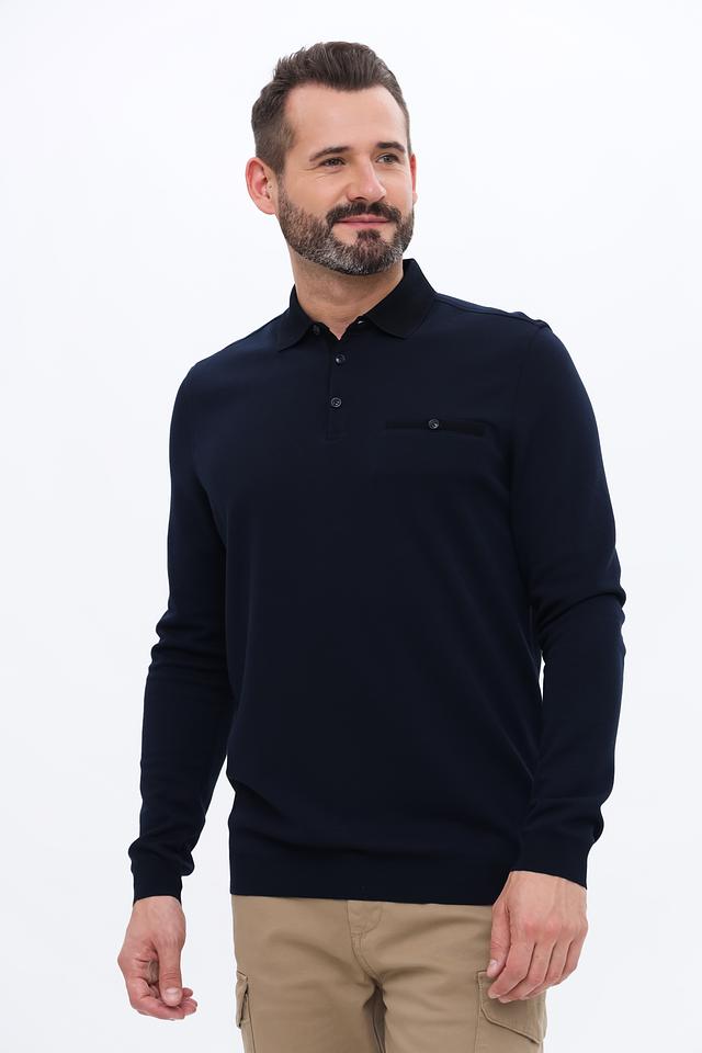 Джемпер имеет воротник-поло с небольшой планкой на пуговицах, что придает ему элегантный вид. На груди расположен накладной карман, добавляющий функциональности и стиля. Длинные рукава и эластичные манжеты обеспечивают комфортную посадку по фигуре.