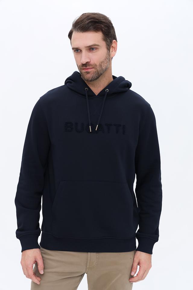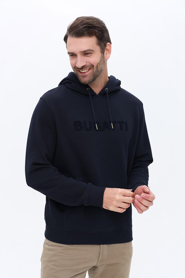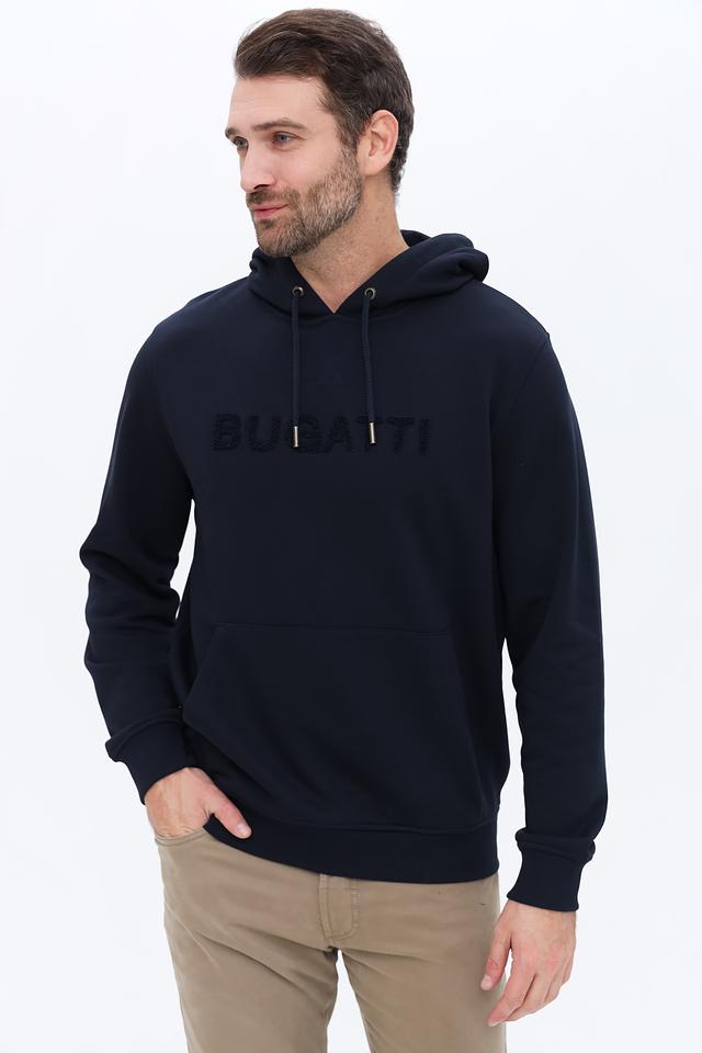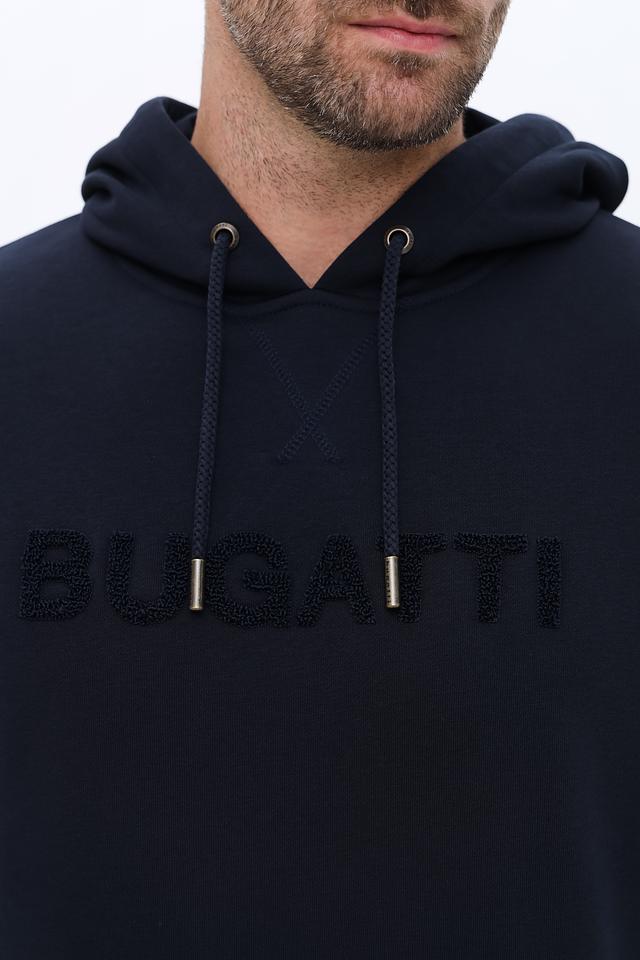 Толстовка выполнена из высококачественного хлопка (87%) с добавлением полиэстера (13%), что делает ее приятной на ощупь, дышащей и износостойкой. На груди расположен логотип бренда Bugatti, выполненный в тон изделия, что придает ей лаконичный и стильный вид.