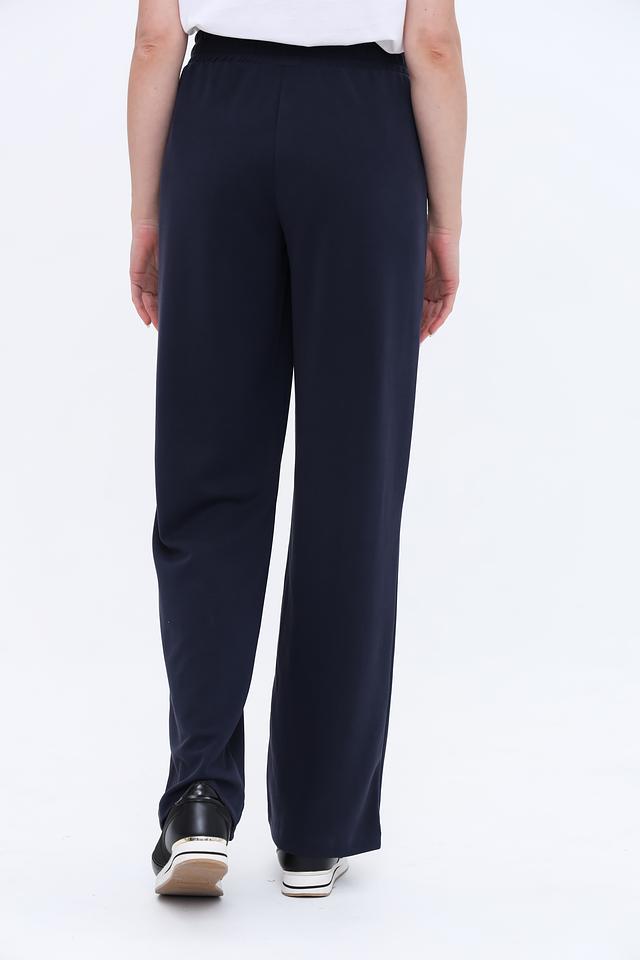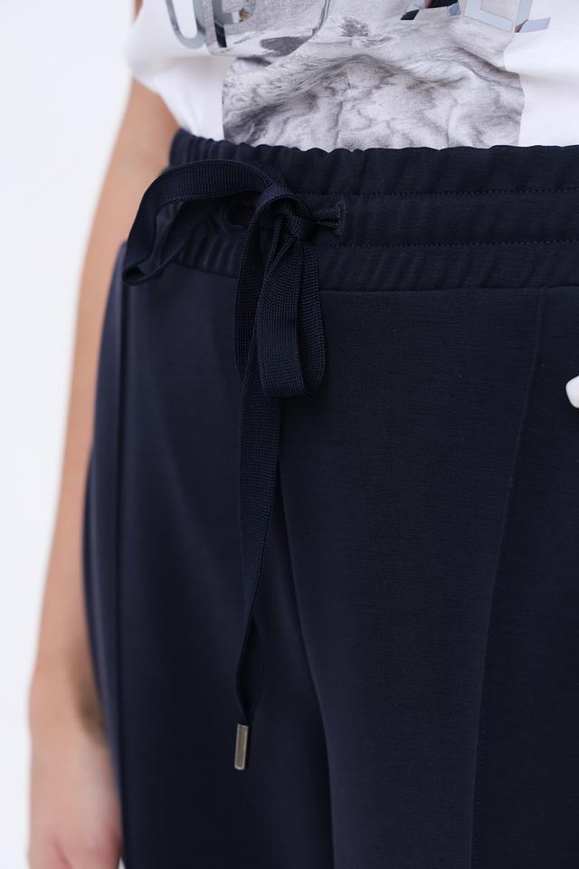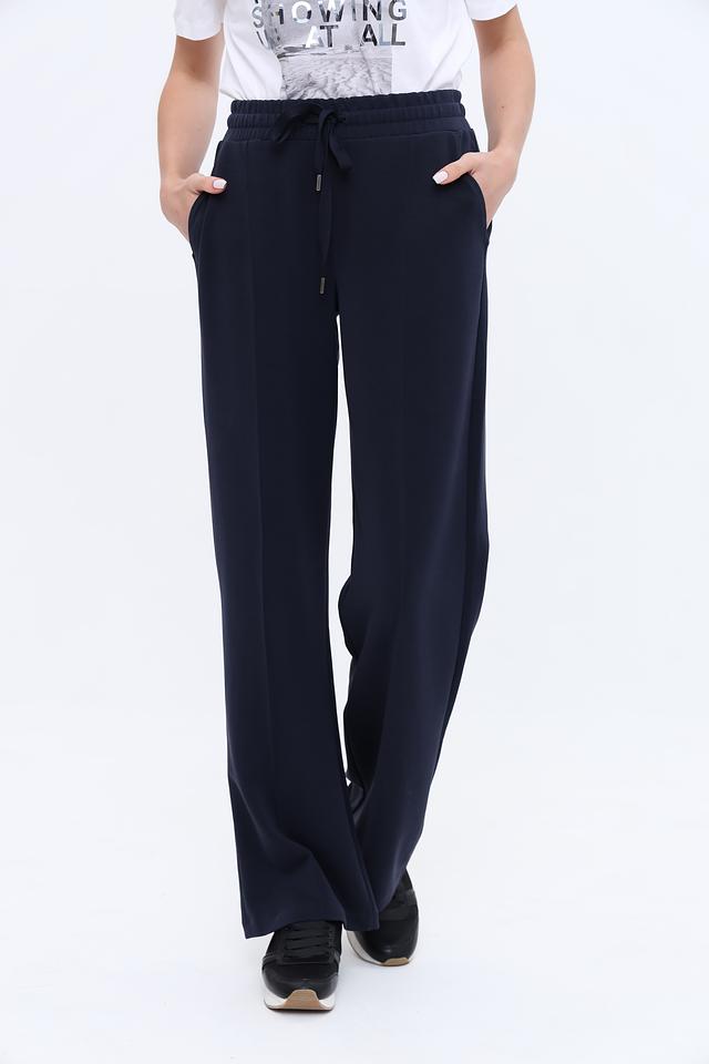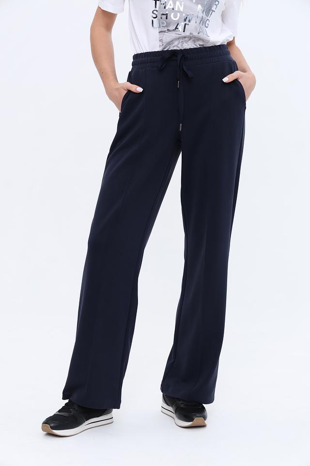 Брюки имеют прямой крой, который подходит для любой фигуры и обеспечивает свободу движений. Завязки на поясе позволяют регулировать посадку, подчеркивая талию. Ткань, состоящая из модала, полиэстера и эластана, приятна на ощупь и хорошо держит форму.