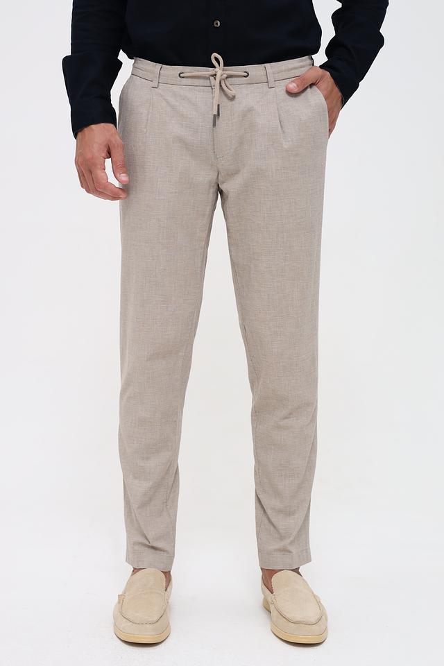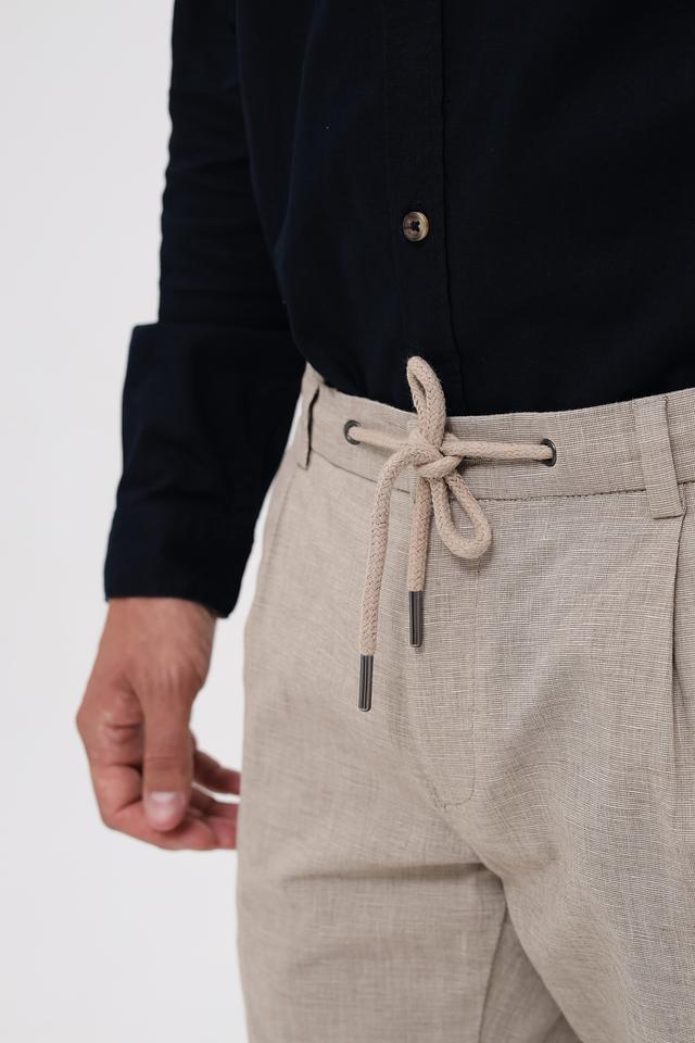 Мужские брюки Bugatti бежевого цвета с удобными завязками на поясе. Модель выполнена из смесовой ткани с добавлением хлопка и льна, что обеспечивает комфорт и воздухопроницаемость. Состав: хлопок 56%, лен 42%, эластан 2%