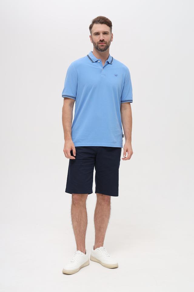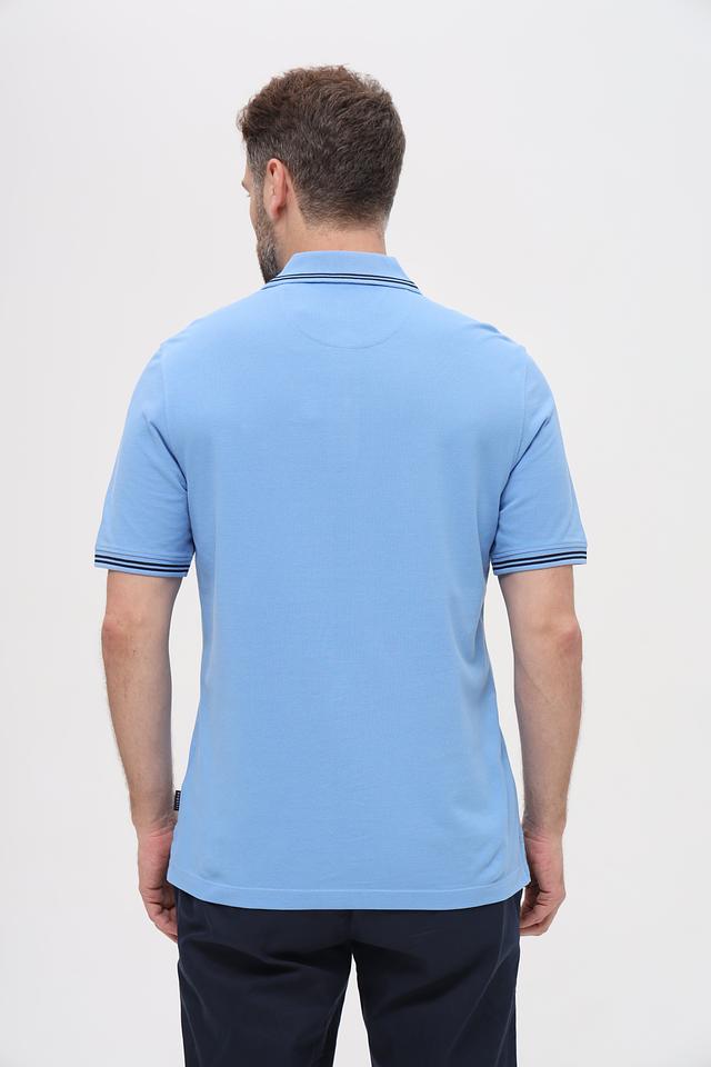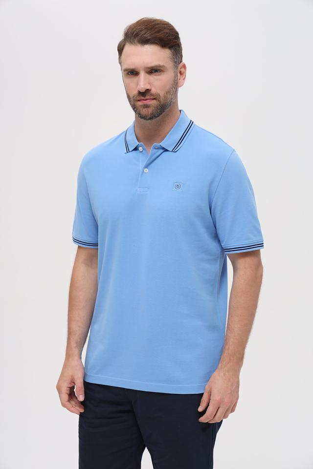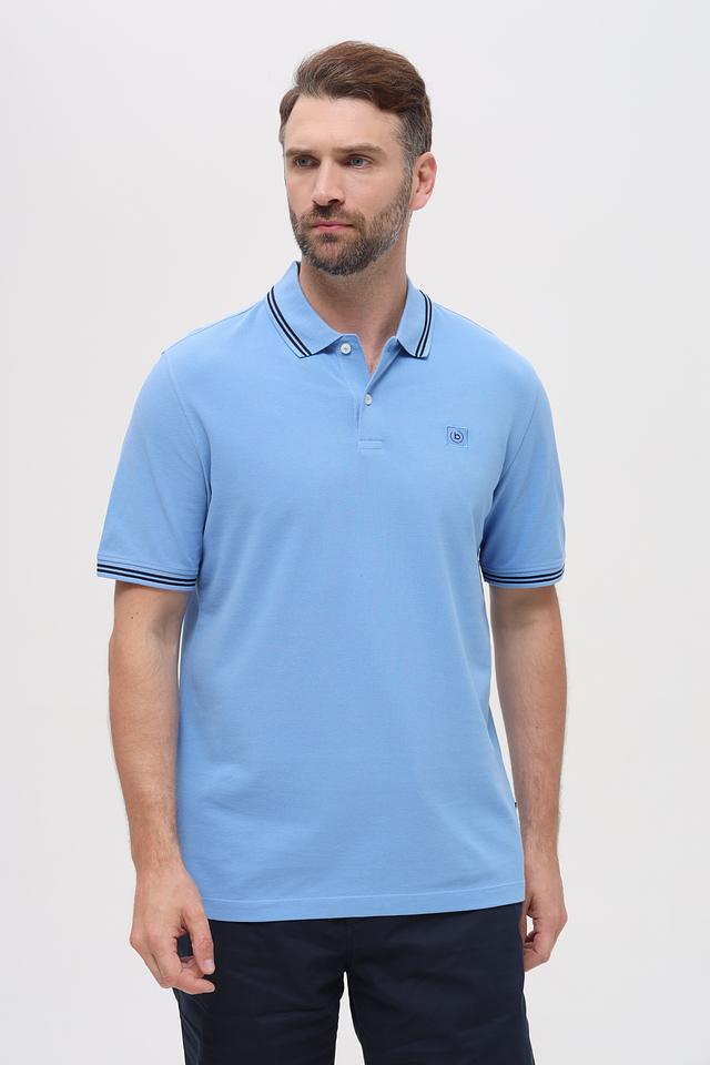 Мужское поло Bugatti голубого цвета с контрастной полоской на воротнике и рукавах. Изготовлено из 100% хлопка, обеспечивающего комфорт и воздухопроницаемость. Стильный и универсальный вариант для повседневного образа. Состав: хлопок 100%