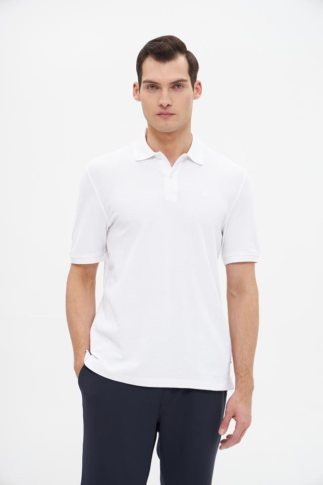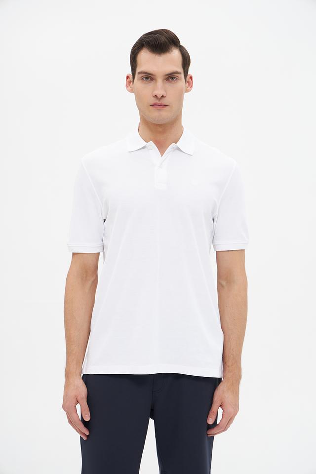 Мужское поло от Bugatti выполнено в классическом белом цвете. Изделие имеет прямой крой, короткие рукава и традиционный воротник-поло с планкой на пуговицах.