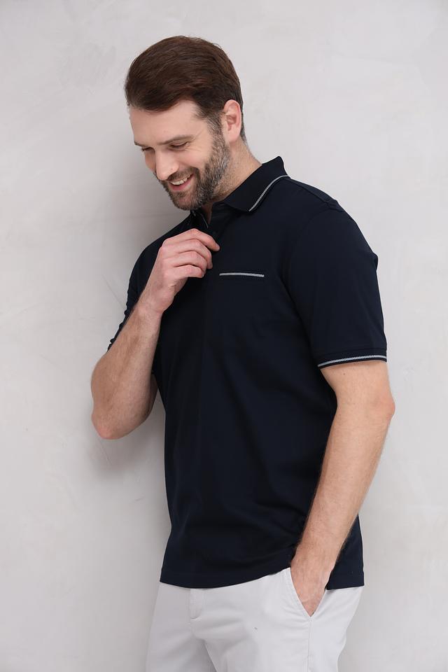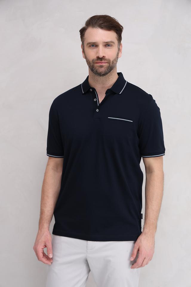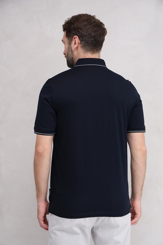 Мужское поло Bugatti темно-синего цвета с контрастной отделкой на воротнике и рукавах. Изготовлено из 100% хлопка, обеспечивающего комфорт и воздухопроницаемость. Состав: хлопок 100%