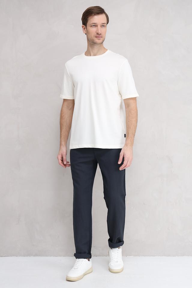 Футболка имеет круглый вырез горловины и короткие рукава. На груди, слева, расположен небольшой логотип бренда, выполненный в тон ткани, что придает изделию лаконичный и стильный вид. Минималистичный дизайн позволяет сочетать эту футболку с различными элементами гардероба – от джинсов и шорт до пиджаков и кардиганов.