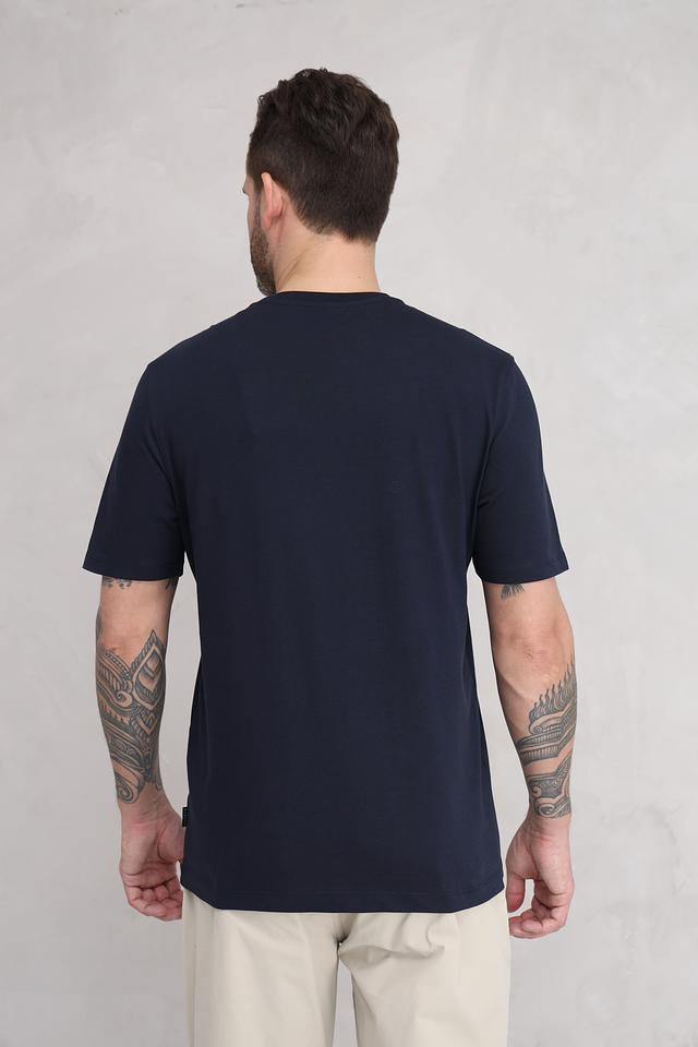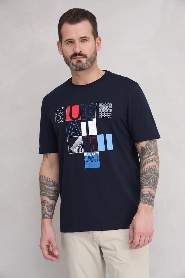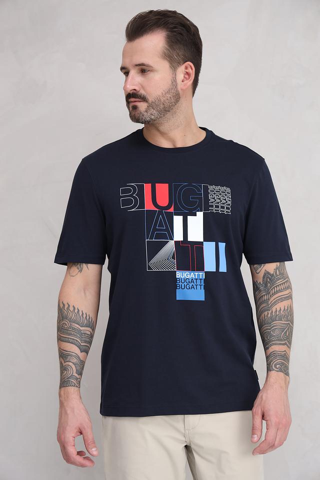 Мужская футболка Bugatti синего цвета с ярким графичным принтом логотипа бренда. Изготовлена из 100% хлопка, обеспечивающего комфорт и воздухопроницаемость. Стильный и современный дизайн. Состав: хлопок 100%