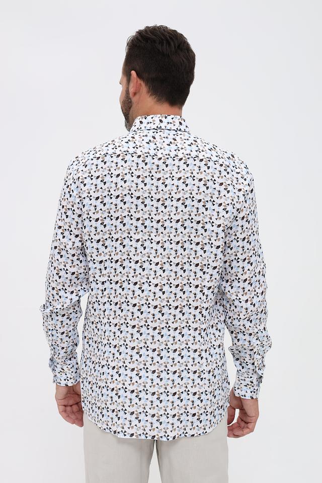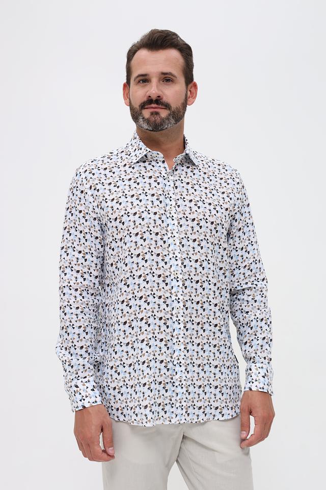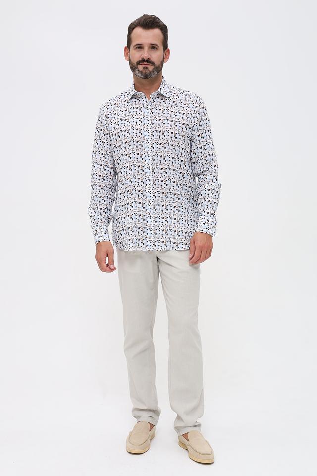 Рубашка имеет классический крой с длинными рукавами и отложным воротником. Её отличает яркий и запоминающийся принт, состоящий из цветочных мотивов в голубой, коричневой и бежевой гамме. Такой рисунок добавит вашему образу оригинальности и свежести.