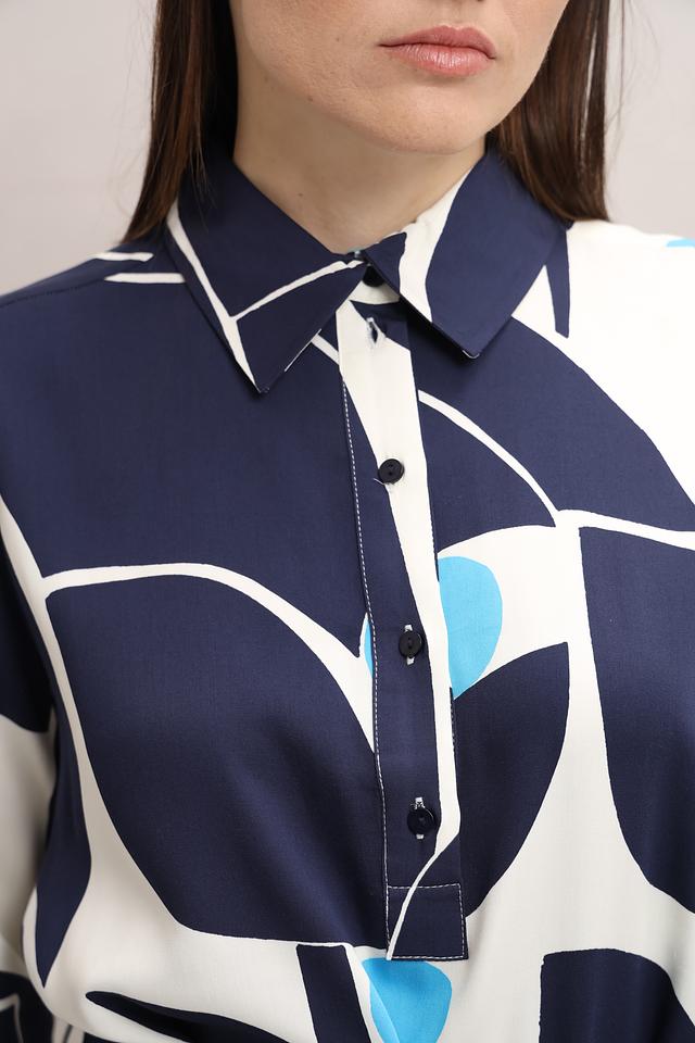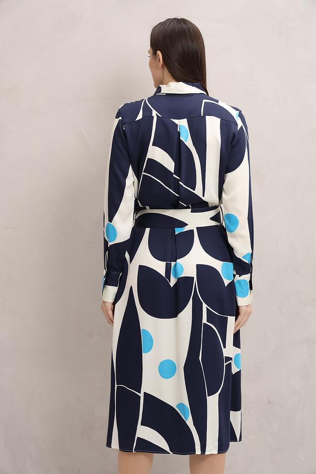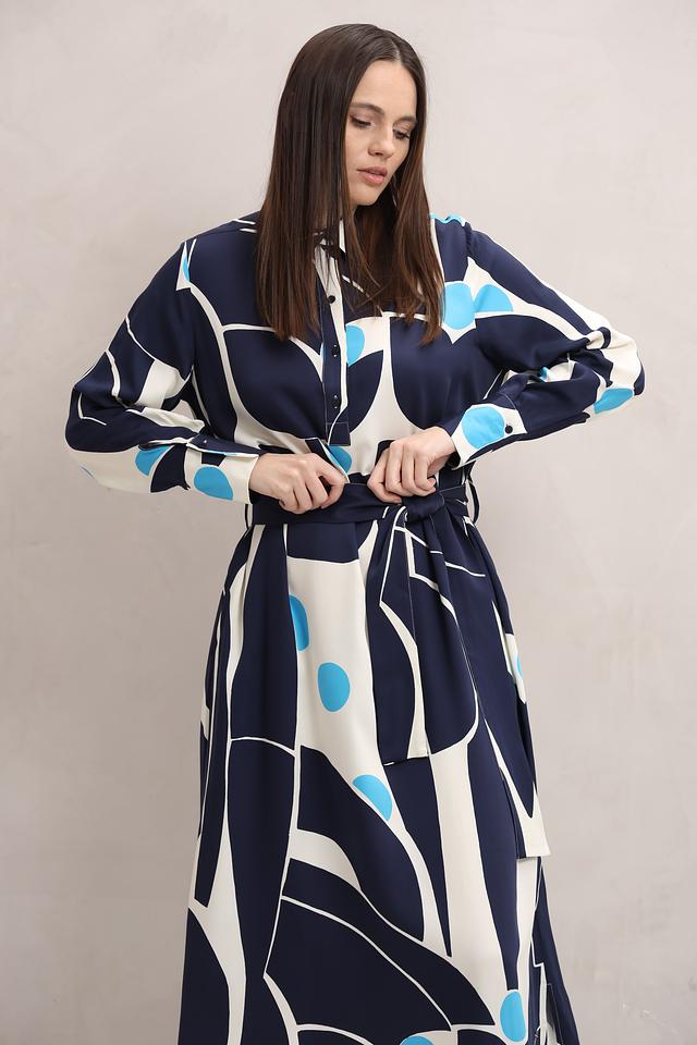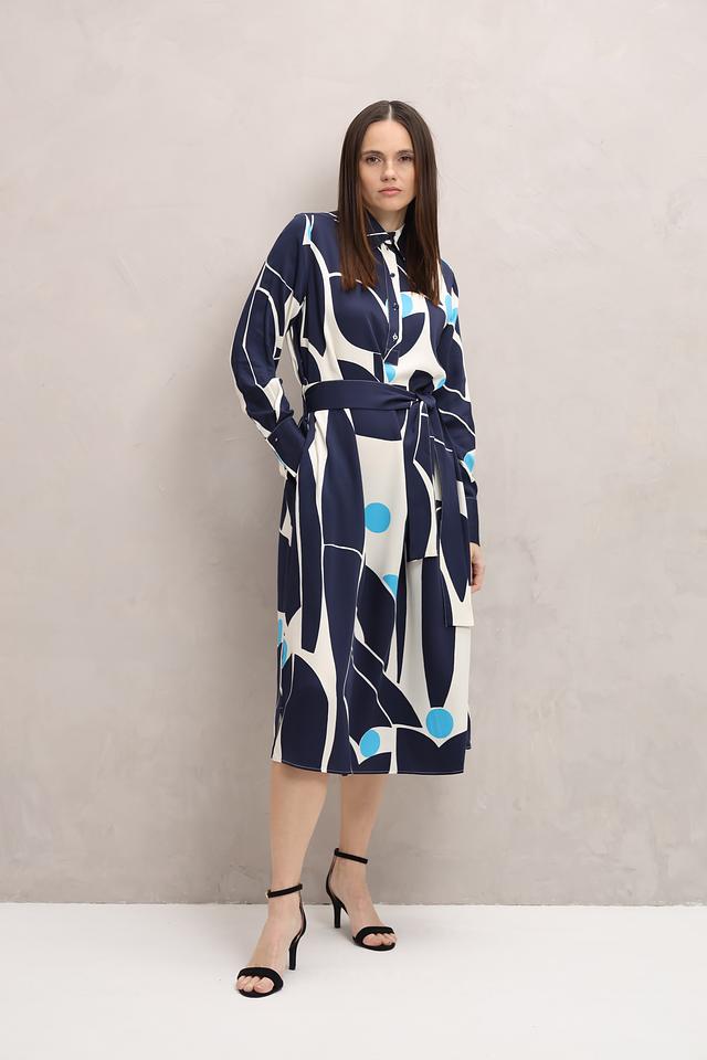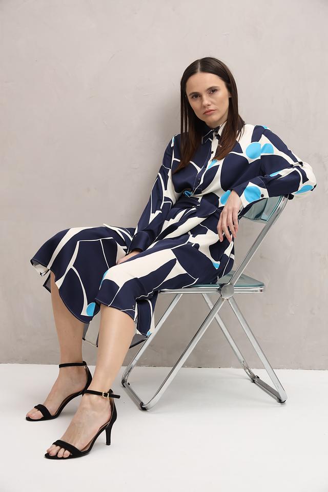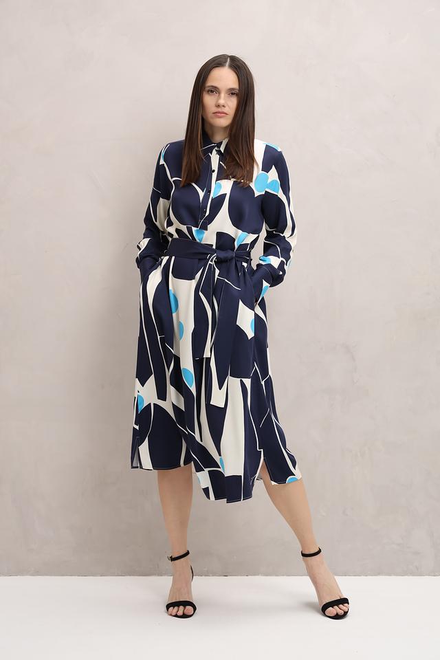 Основной цвет платья – глубокий синий, который гармонично сочетается с белым и голубым геометрическим принтом. Такой рисунок делает модель яркой и запоминающейся. Платье имеет длинные рукава и воротник рубашечного типа, что добавляет ему строгости и деловитости.