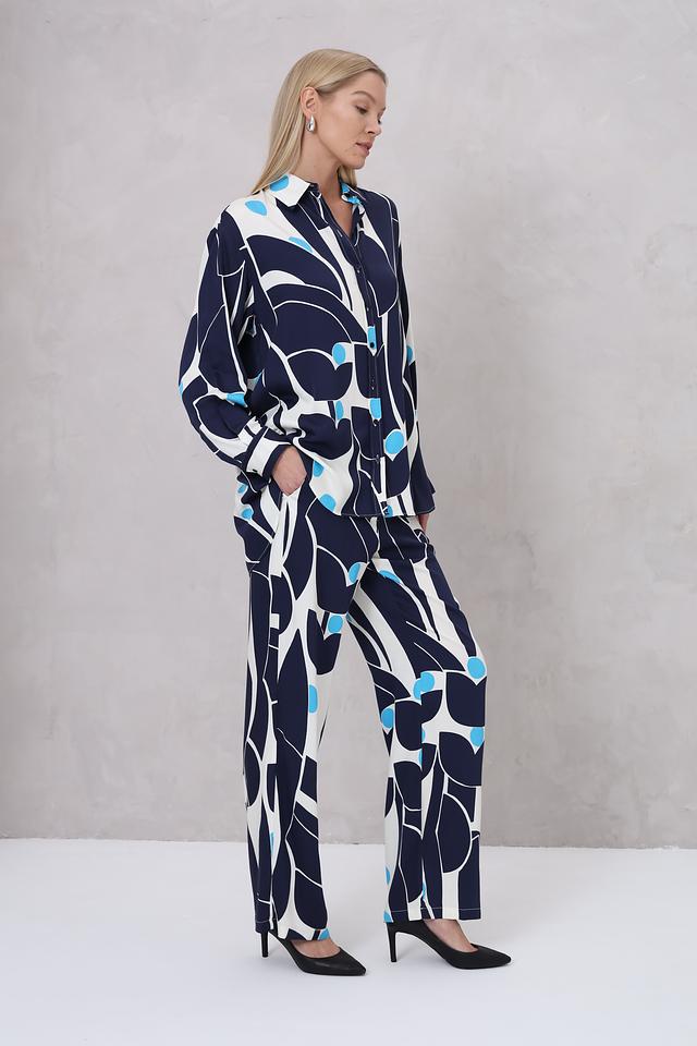 Особенностью модели является яркий и необычный геометрический принт, сочетающий в себе оттенки синего, белого и голубого. Прямой крой брюк подходит для любого типа фигуры и позволяет создавать различные комбинации с другой одеждой.