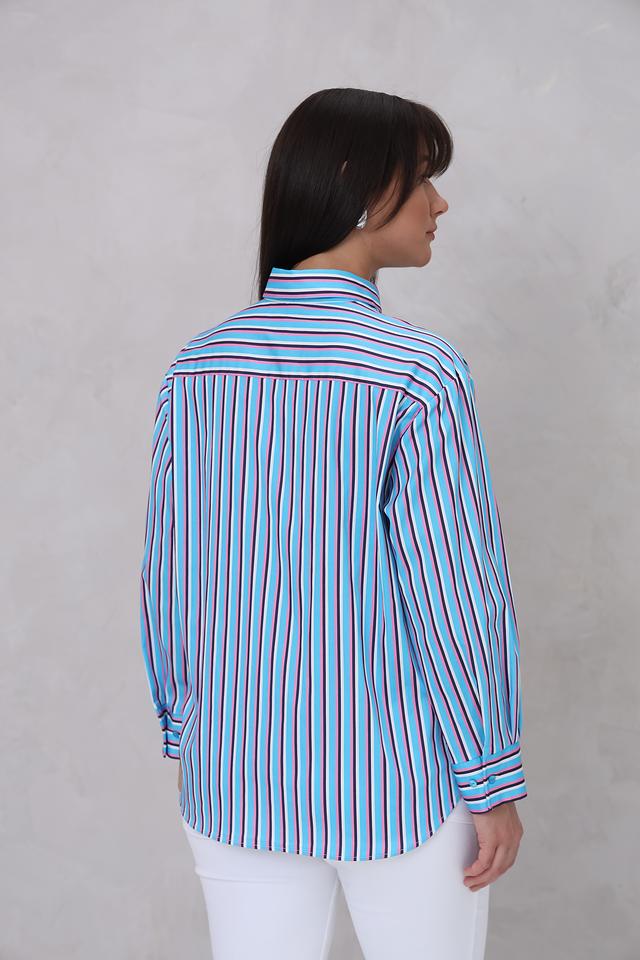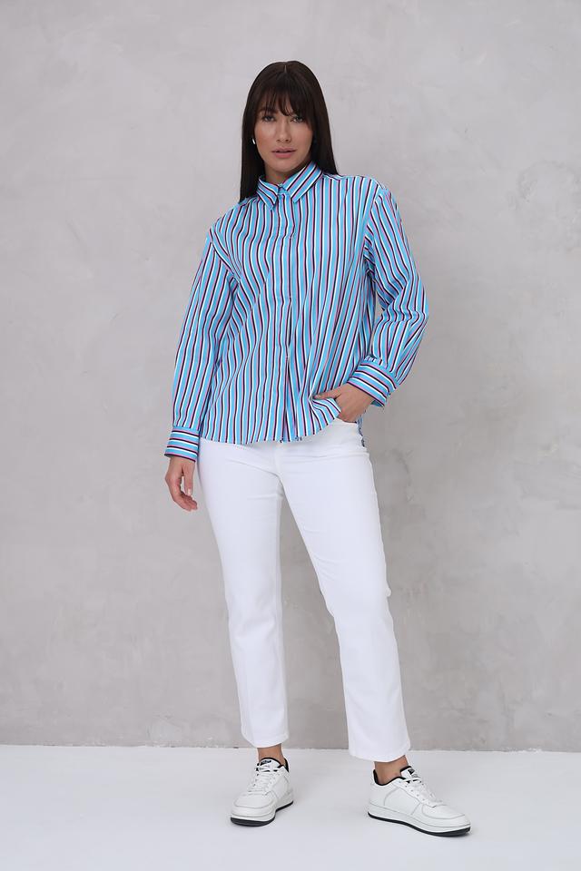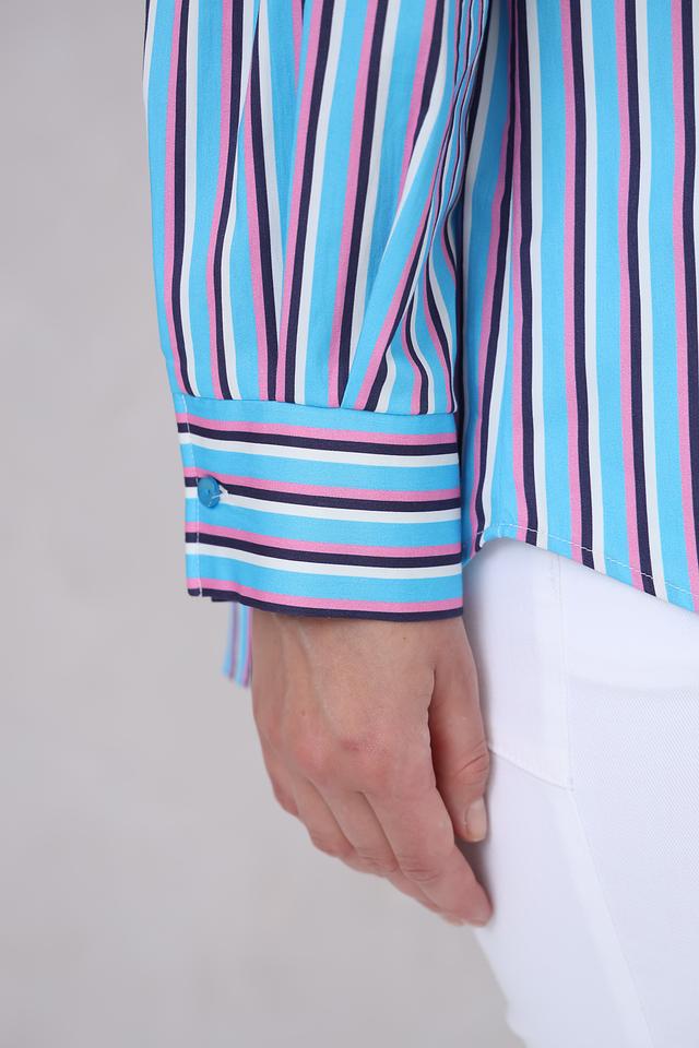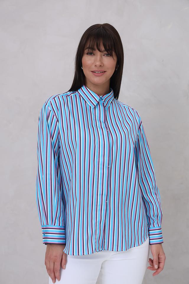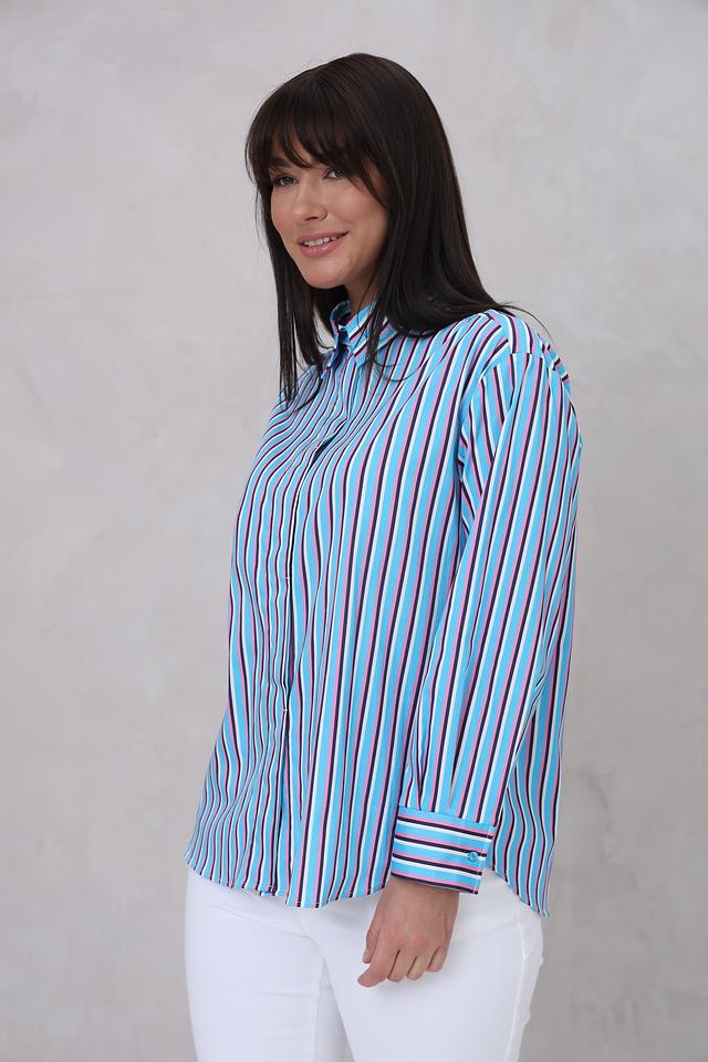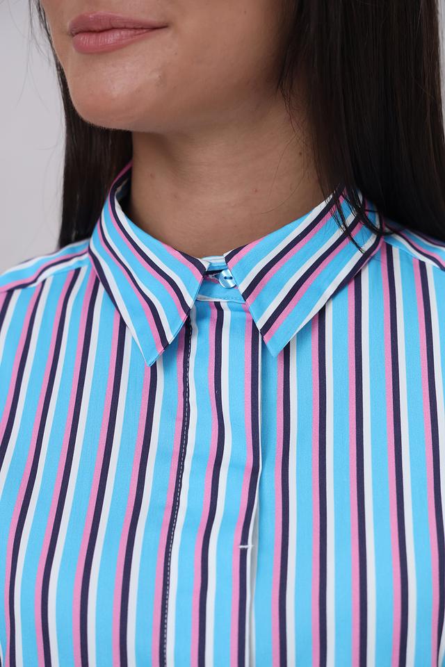 Женская рубашка Bugatti голубого цвета с ярким полосатым принтом. Модель с длинным рукавом и классическим воротником станет отличным дополнением к вашему гардеробу. Состав: хлопок 70%, полиамид 27%, эластан 3%